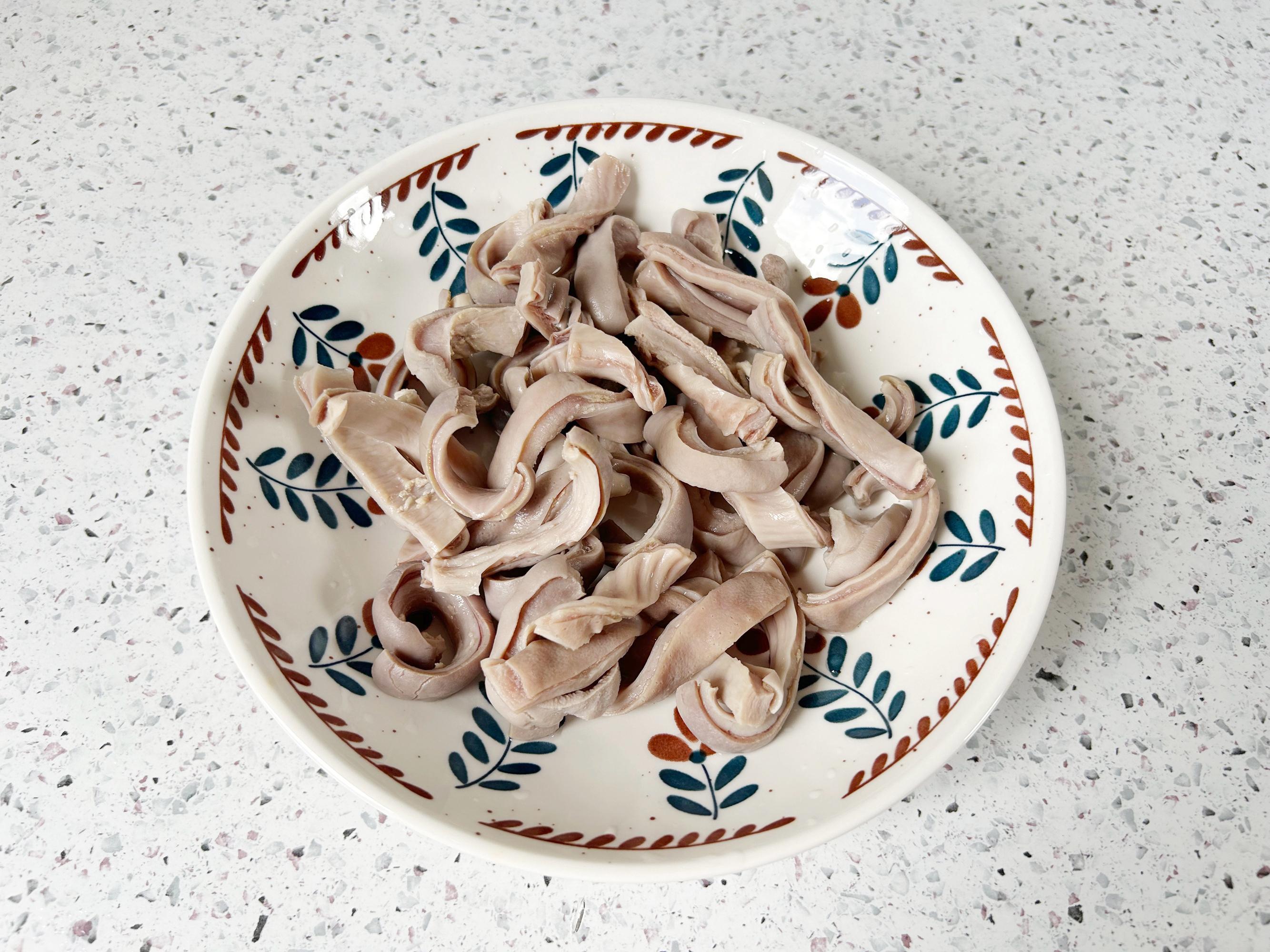 豬肚冷水進鍋,加入料酒,開中火煮開,再煮5分鐘,把豬肚撈出來清洗乾淨,切成細長條狀。