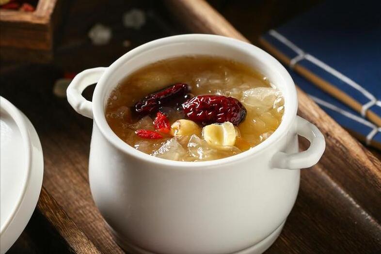 2、銀耳泡發好之後,清洗乾淨、撕成小塊,倒在鍋子裏添上清水開始煮,大火煮開後轉小火,煮上40分鐘左右,然後放上蓮子繼續煮上20分鐘的樣子,最後加入枸杞和冰糖調味,冰糖融化之後就可以出鍋了。