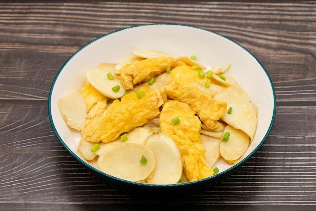 2、接下來咱們往鍋中倒油,燒熱後下入蛋液翻炒,炒到蓬鬆、定型後就可以盛出來了。接下來重新往鍋內倒油,下入茭白翻炒,炒製片刻直至斷生後,放入雞蛋,然後用鹽和雞精來調味,紅辣椒也倒進去,繼續翻炒兩下,撒上蔥花出鍋。