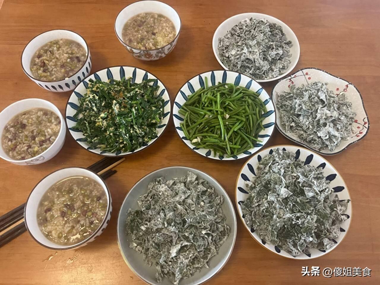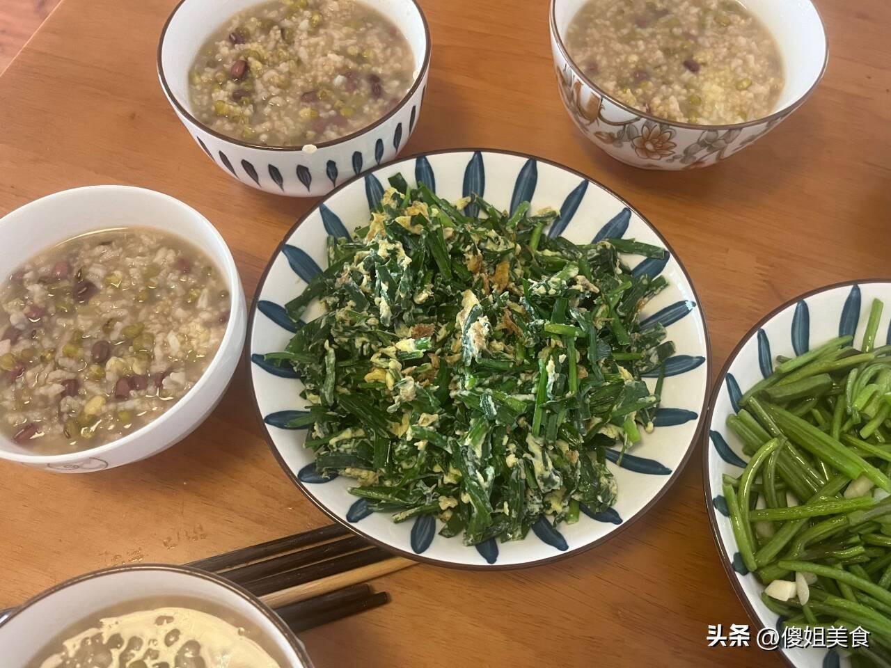 嫂子還給了一把韭菜,韭菜很新鮮,就用家裏的土雞蛋炒了一下,鹹香味俱全,放在蒸熟的紅薯葉裏拌一拌,超好喫。孩子們都喜歡喝粥,用電飯煲煮了一鍋很稠的粥,當了點綠豆,天熱也能解暑,簡單家常的飯菜家人都愛喫,清淡爽口還解油膩。