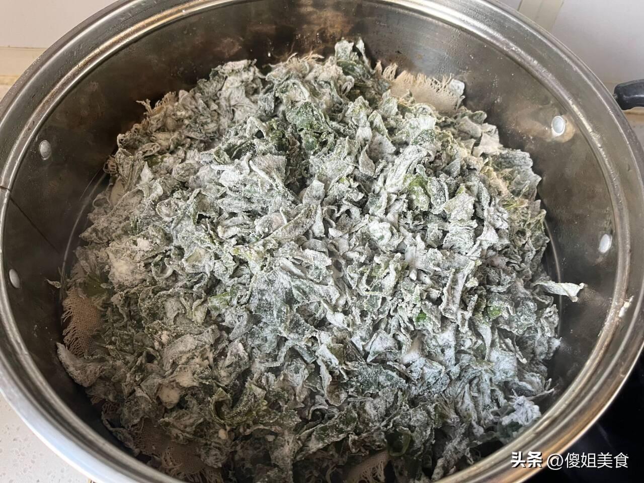 新鮮的紅薯葉擇下來後用流動的清水多衝洗一會,把表面的泥土洗乾淨,然後把紅薯葉子攥幹水分,改刀切成小碎段放入大一點的盆內。接下來取適量的乾麪粉撒在紅薯葉子上,一定要少量的撒,然後抖擻一下,繼續撒,直到每個紅薯葉上面裹滿均勻的麪粉就可以。