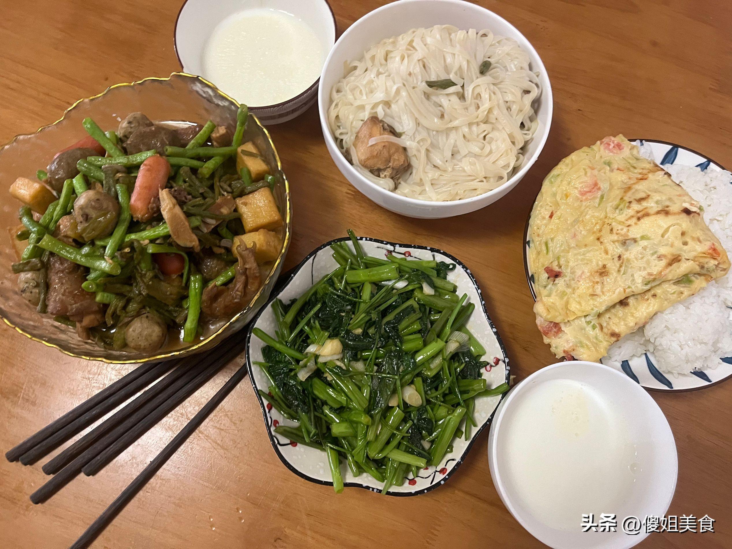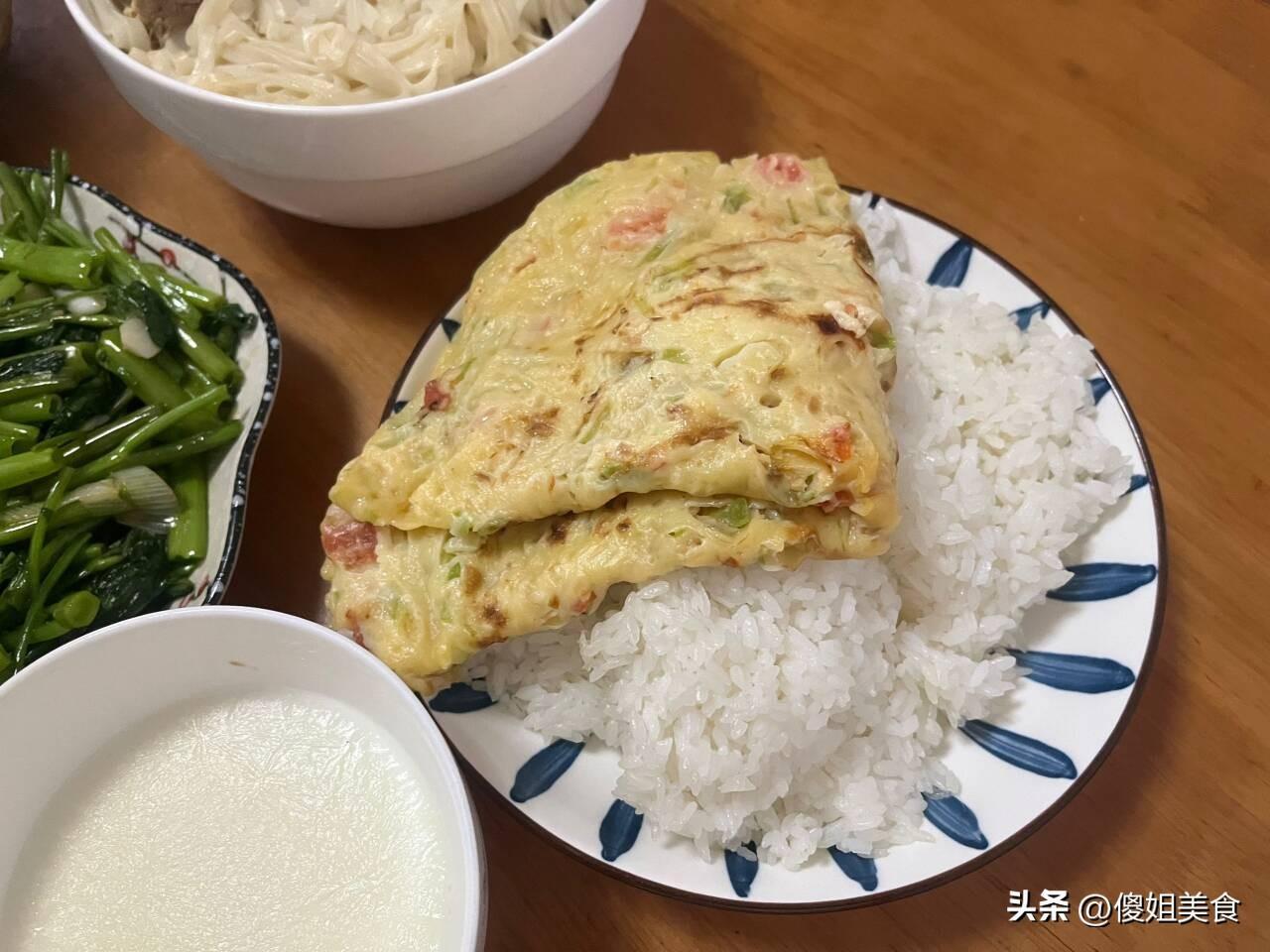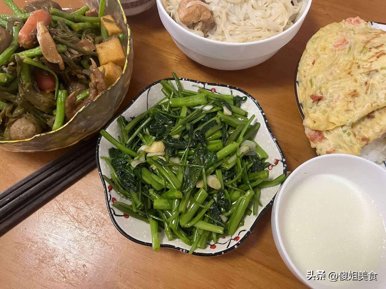 雞蛋餅和米飯都是早上剩的,直接放在蒸鍋裏熱了一下,兒子和婆婆喜歡喫米飯,一人一份,澆上亂燉的湯汁,拌一拌很好喫。我喫的是雞蛋餅就空心菜,喧軟又好喫。
