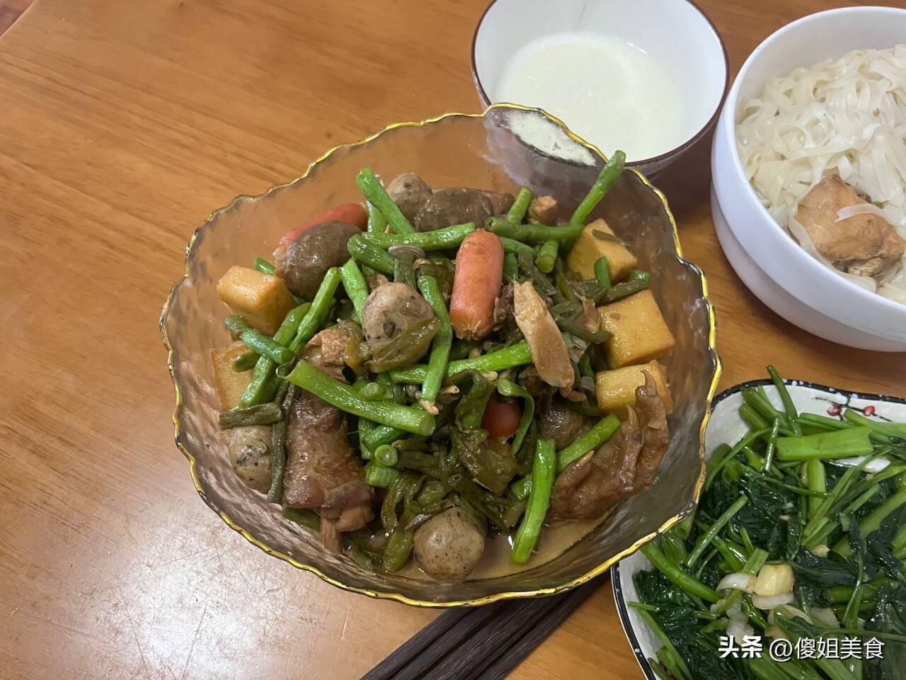 昨天晚上燉了只雞,喫剩下一半,正好中午放一些孩子愛喫的火鍋丸子,再順便放點家裏的豆角,來個亂燉肯定好喫,把所有食材都倒入鍋中,也不用熗鍋,燉雞的湯汁就很好喫,豆角和丸子燉熟透後關火盛出來就可以。看出婆婆疼孫子來了