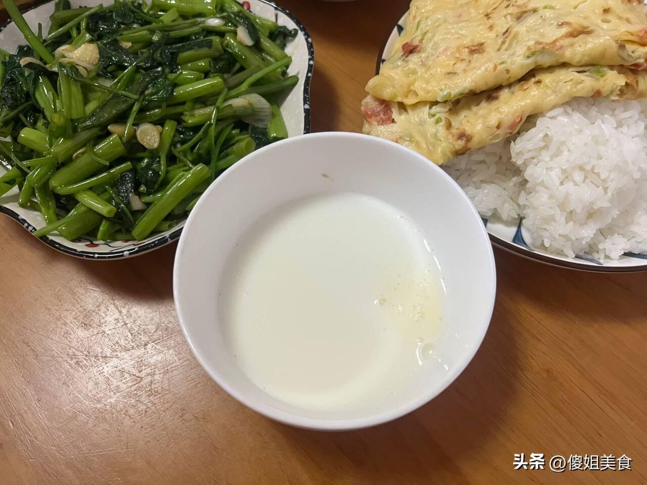 中午也沒有煮湯,就提前把凍在冰箱裏的鮮奶拿出來融化着,用乾淨的煮鍋加熱了一下,兒子和婆婆一人一碗,我也沒捨不得喝。兒子還讓我嚐了一口,鮮奶就是好喝。簡單的午飯省事還好喫。