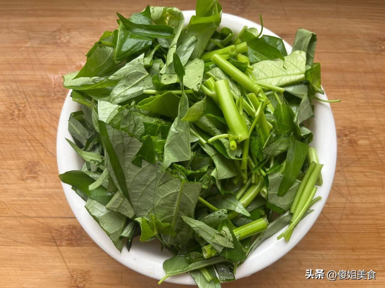 空心菜有着獨特的澀味和青草氣,口感脆嫩、爽口,營養豐富。空心菜含有豐富的維生素A原、B族維生素、鈣、鐵等,能夠很好的清熱解毒、潤膚美容,夏天多喫它對身體好。花3塊錢買了一小把空心菜,空心菜很新鮮清洗過後直接切成小段,然後控一下水分備用就可以。