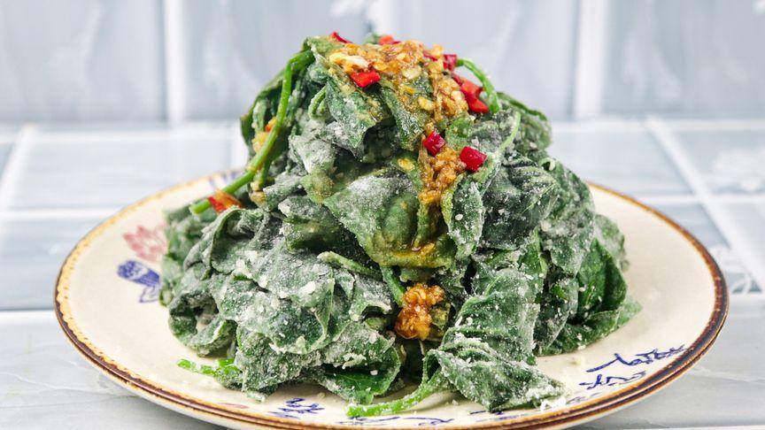 1、紅薯葉洗淨,控幹水分。撒上面粉,讓每片葉子都裹上面粉。
