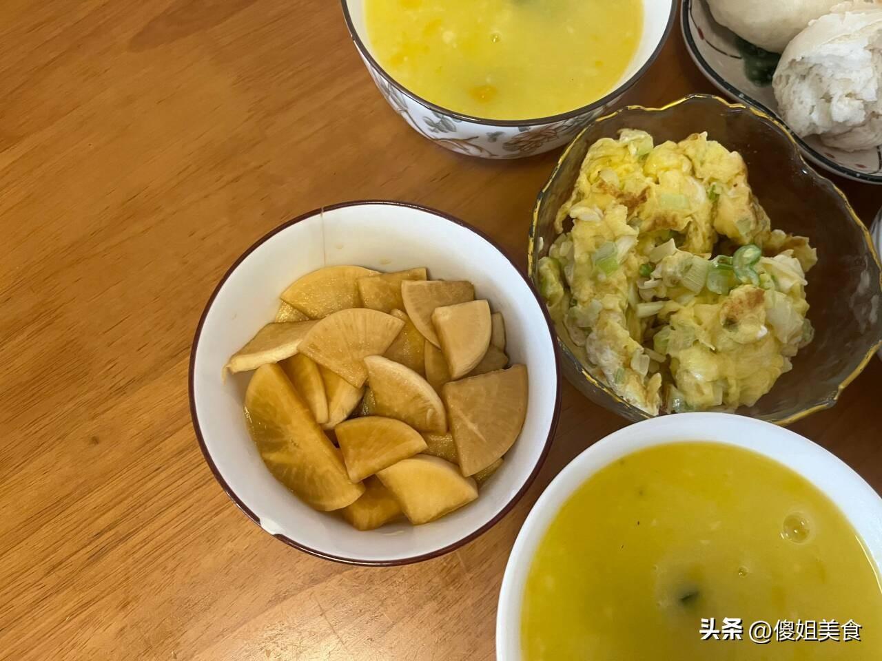 和婆婆媽住在一起就是好,一日三餐我都不用做,包括孩子的衣服都不用洗,婆婆打理的家裏是一塵不染。每天我起牀洗漱完後就喫早飯去上班,每天下班回到家就能喫現成的飯,感覺自己特別的幸福。婆婆每天也不嫌累,早上5點鐘就開始起牀打理她的小菜園、收拾院子、做早飯,今天早上的早餐真豐富,南瓜麪糊粥配婆婆醃的蘿蔔鹹菜是真好喫,鮮美清爽,簡單還省事,下面就和大家分享一下婆婆做的營養早餐,一起來看看吧。