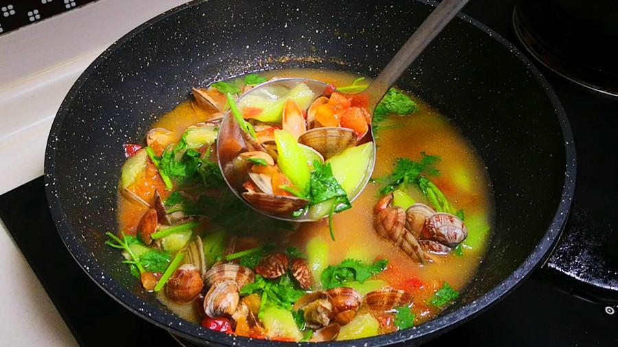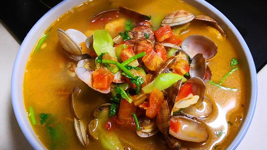 所需食材:絲瓜、花蛤、西紅柿、香菜