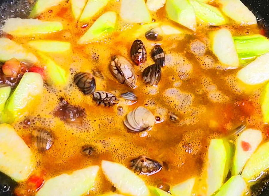 4.熱鍋燒油,放入西紅柿丁翻炒,炒出西紅柿的汁水後,再倒入絲瓜,中火翻炒片刻,要不停地用鏟子翻動,讓絲瓜塊受熱均勻,防止將絲瓜表面炒黃,影響湯品的顏值。然後倒入花蛤,加適量的食鹽的胡椒粉,接着倒入適量的清水,大火將其將開。
