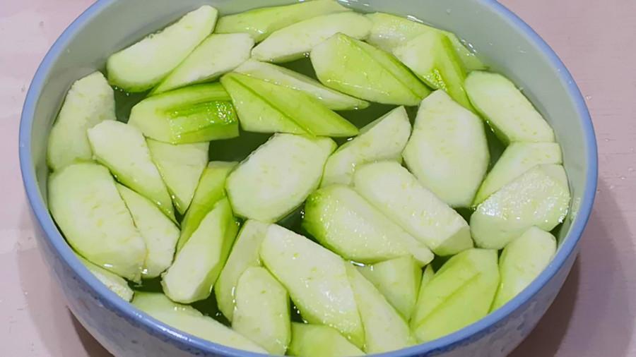 沖洗乾淨後再將絲瓜切成滾刀塊,做湯絲瓜切滾刀塊,煮的過程中可以更好地保持它的形狀,不至於煮爛掉。切好的絲瓜放到清水中浸泡備用,防止它氧化變黑。