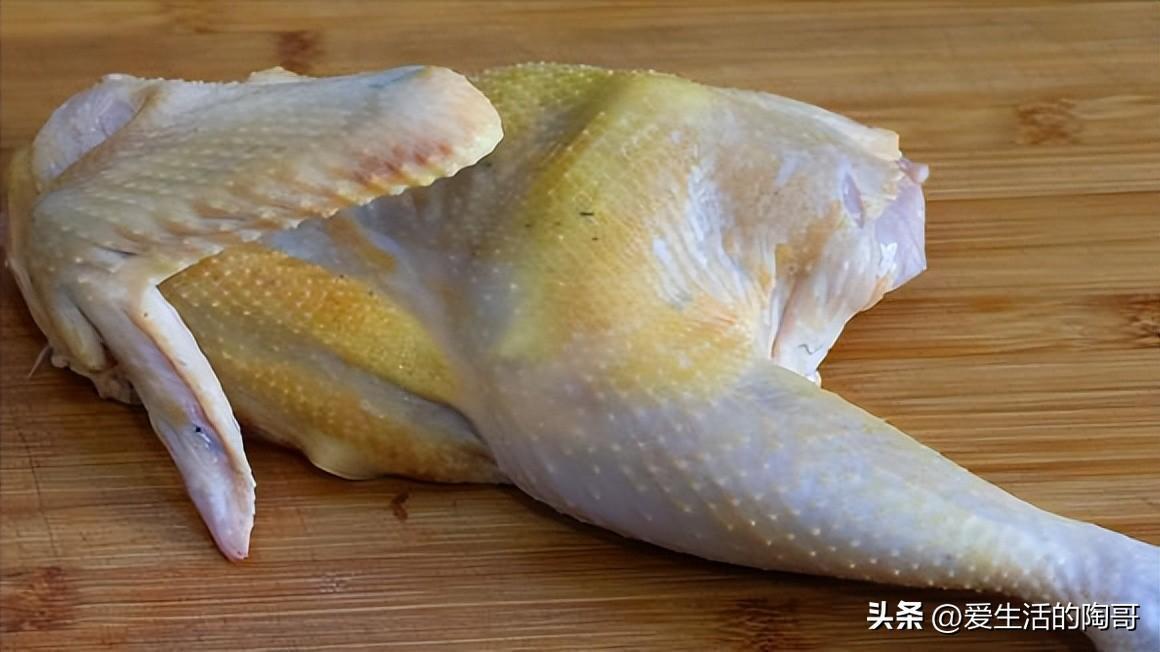 2三黃雞清洗, 切塊,放進水裏漂洗,鍋裏燒熱水,水沸後,放進雞肉塊,加入料酒,去掉血末,瀝乾水分