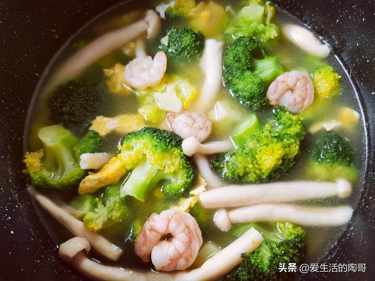 食材:西蘭花半個,蝦仁適量,蟹味菇,蔥,姜,鹽, 胡椒粉,雞蛋2個