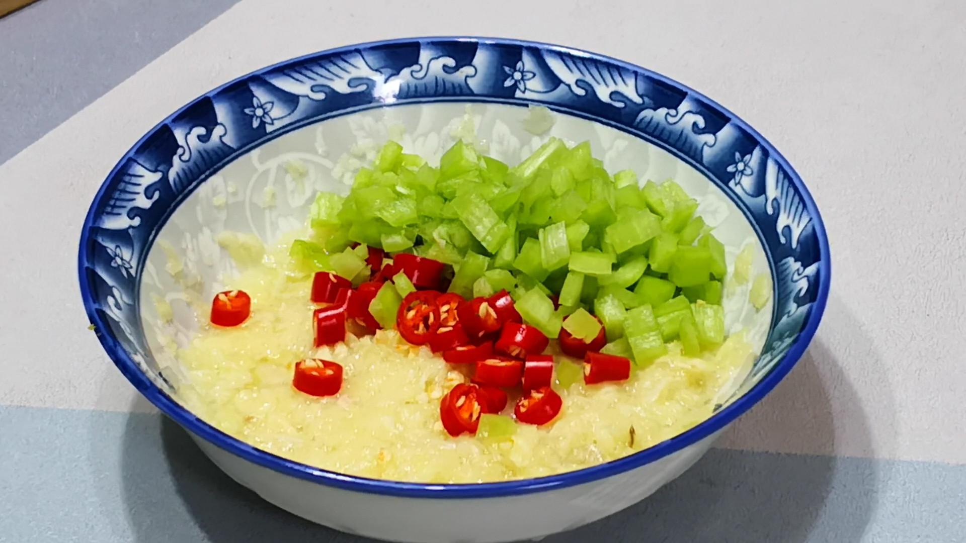 最後把切好的尖椒碎、香菜段和小米辣全都放到蒜泥中,再加入2勺食鹽、兩勺生抽和適量蠔油,攪拌均勻後備用。