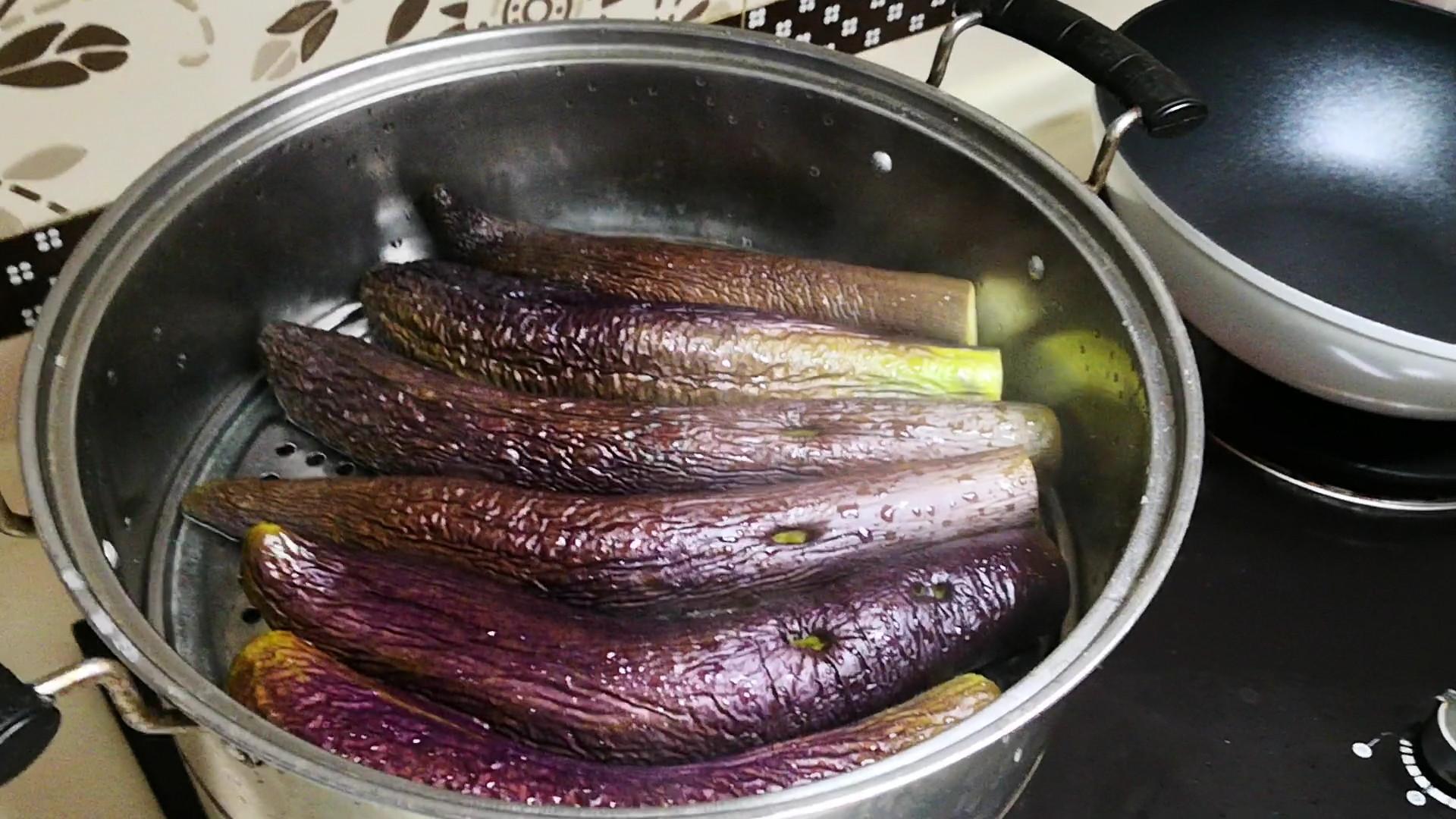 4.茄子大約蒸10~15分鐘就好了(具體時間根據自己蒸的茄子大小調整),茄子用筷子扎一下,能很輕易扎透就說明蒸好了,取出茄子放到蓋簾上讓其自然晾涼。