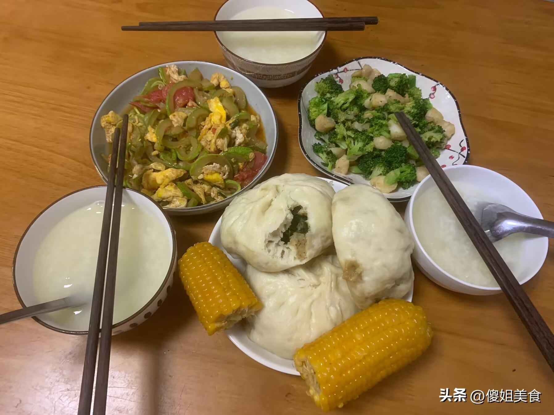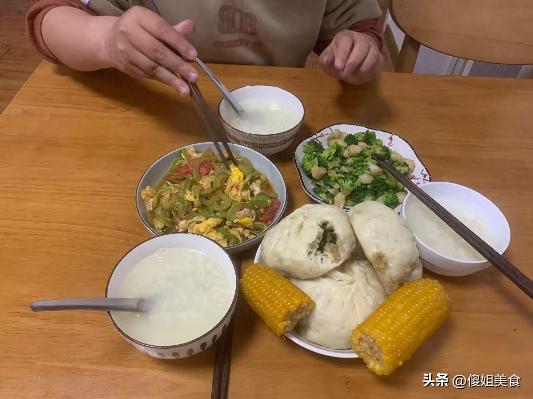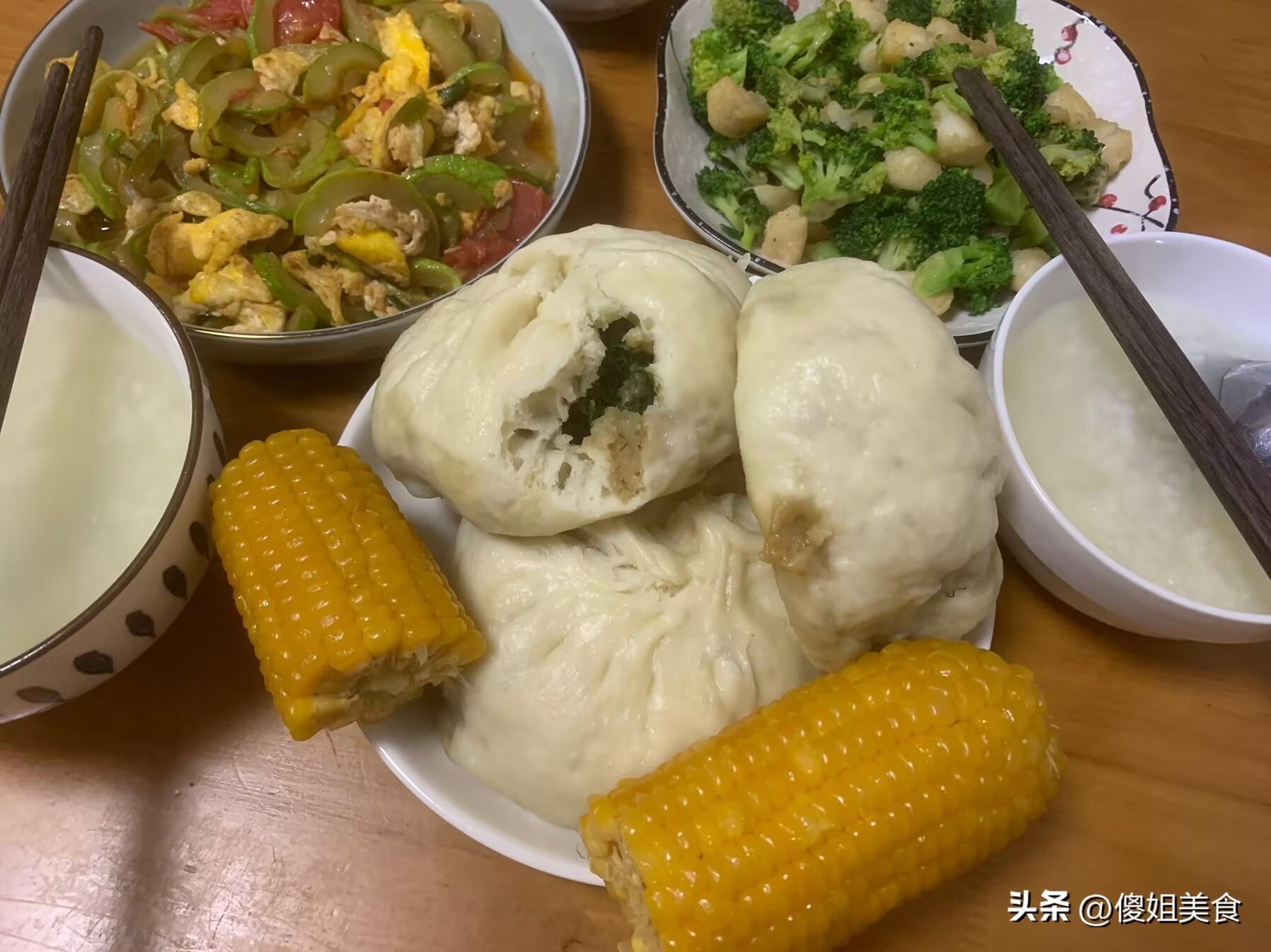 花10塊錢買了4個粘玉米,放在鍋內煮了15分鐘,順便把前幾天蒸的韭菜豬肉餡的包子熱了熱。孩子太喜歡喫包子了,抱着大包子就啃,也沒少喫蔬菜,我晚飯一搬不喫主食,就喫了一個玉米和2碗粥。