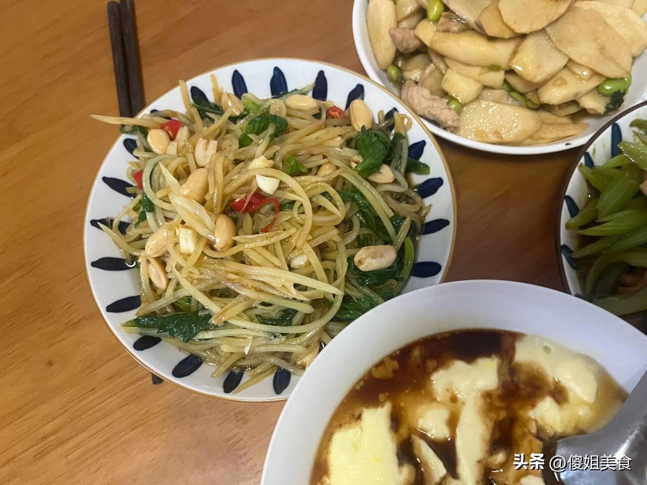 芹菜葉我沒有丟掉,弟媳婦說天這麼熱正好去它拌涼菜喫,肯定超好喫。芹菜葉一焯水很少,就放了一個土豆,土豆去皮後切成細絲,弟媳婦這刀工比我都好,切的很細。把土豆絲和芹菜葉焯水後過涼一下攥幹水分,往土豆絲內放一勺陳醋、少許白糖、1勺蠔油和適量味極鮮,再放點小米辣、蒜粒,用剛熬好的熱熟油澆在上面,隨手一拌清淡爽口,賊好喫。