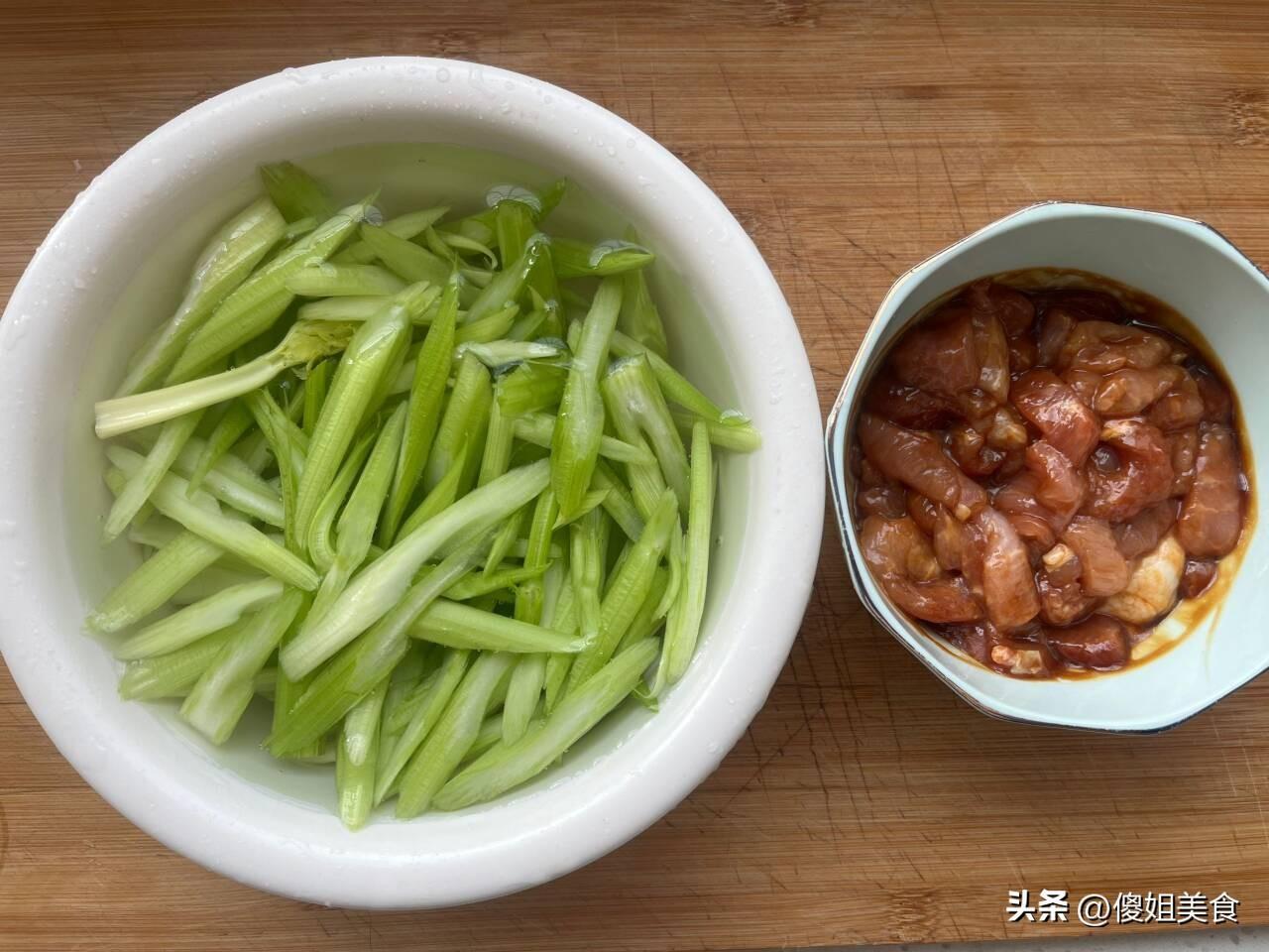 我家弟媳婦廚藝槓槓好,每到過年我們姐妹三人回孃家的時候都是弟媳婦掌勺,我們打下手,幫忙擇洗菜。今天也是我擇芹菜,弟媳婦負責炒。芹菜葉子擇下來不要扔掉,煮湯、涼拌都可以,擇洗好的芹菜斜刀切成小段,用清水清洗2遍瀝水備用。再準備適量的豬瘦肉,豬肉放入少許澱粉、蠔油、味極鮮抓拌醃一下,喫起來更滑嫩。