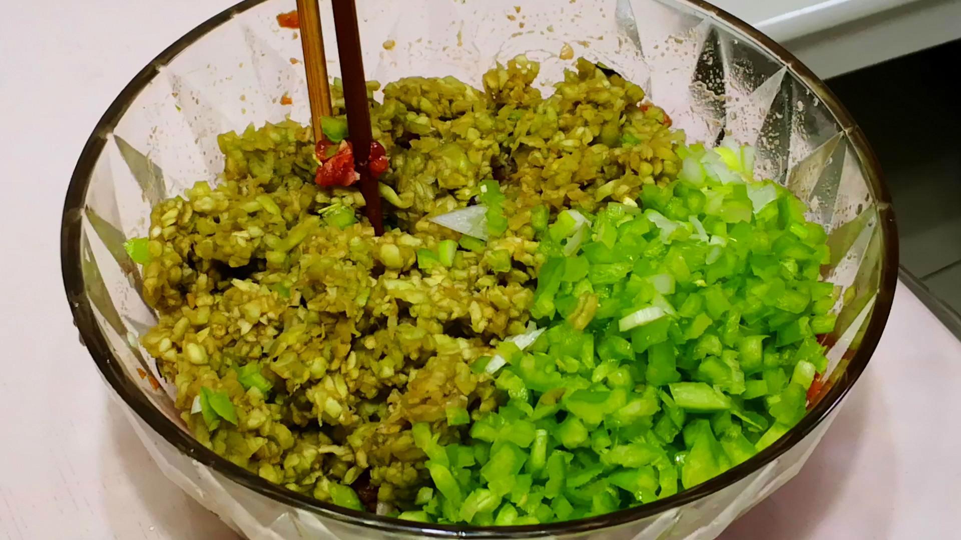 5.然後將切好的茄子丁和青椒丁放到肉餡中,再倒入炸香的黃豆醬,少加一點點食鹽,用筷子完全攪拌均勻即可,好喫的茄子餃子餡就調好了。