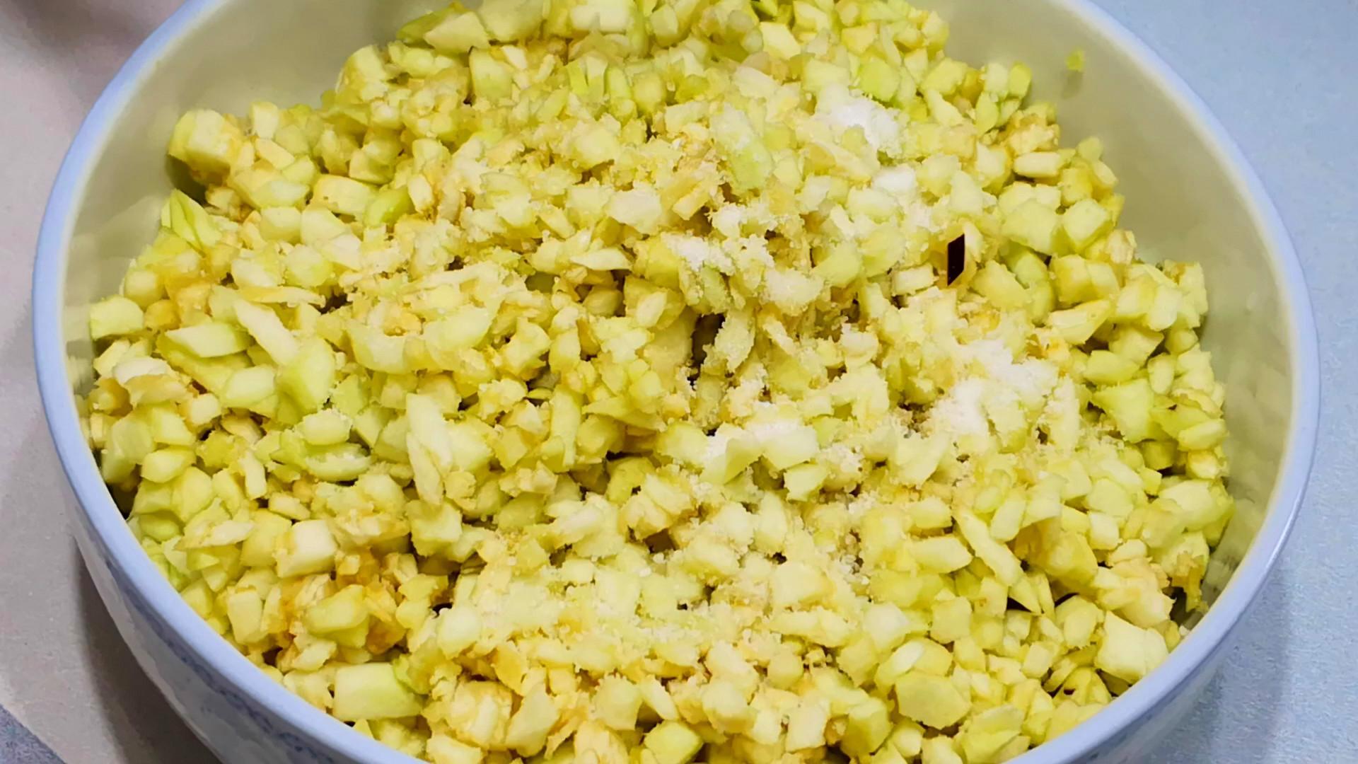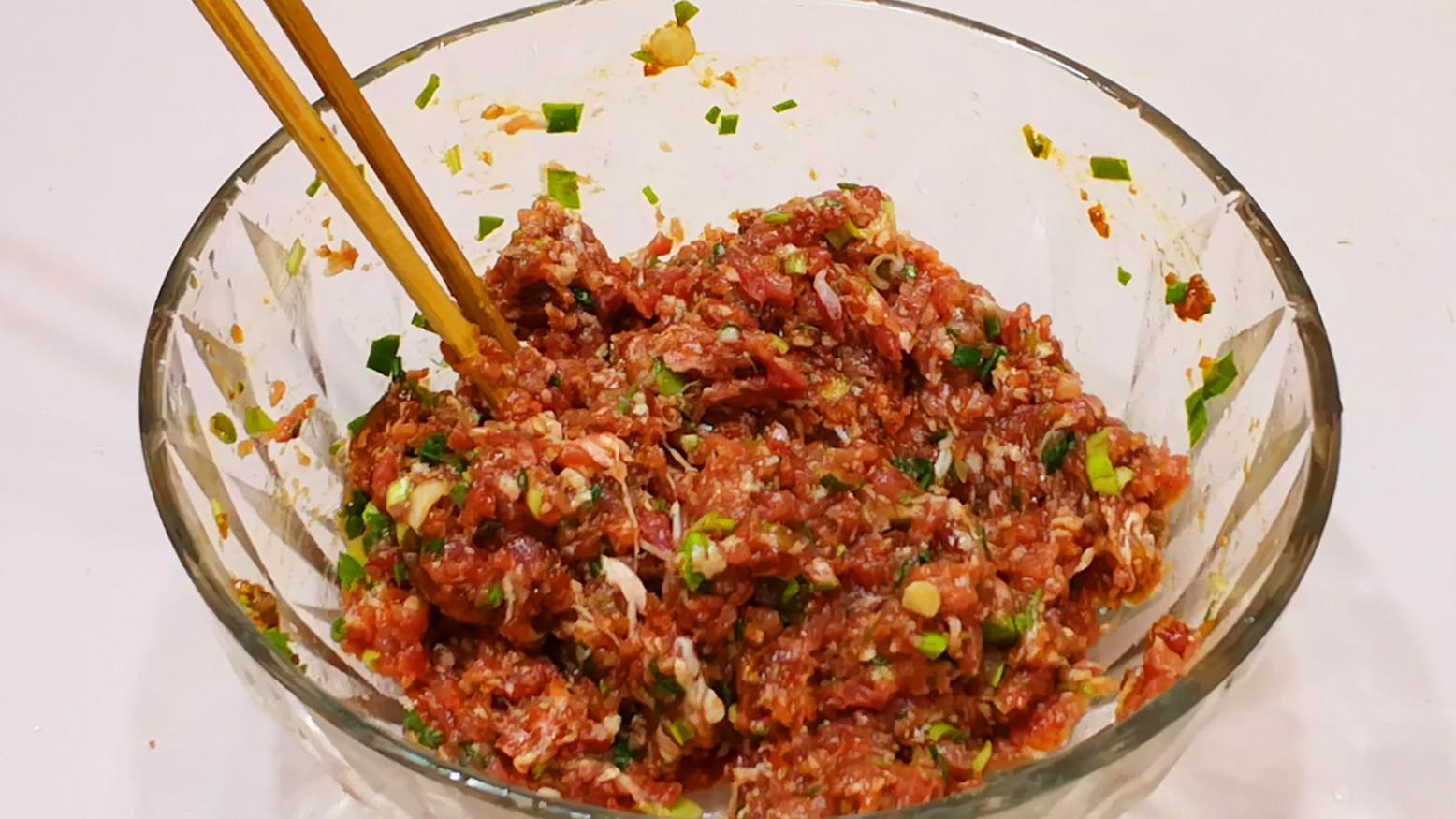 2.調肉餡,取一塊豬肉用刀剁細或是用絞餡機絞成肉餡,然後加入蔥花、薑末、兩勺生抽、一勺蠔油、少許老抽、適量的花椒粉和一個雞蛋,用筷子順着一個方向將其充分攪拌均勻後,放一邊醃製備用。