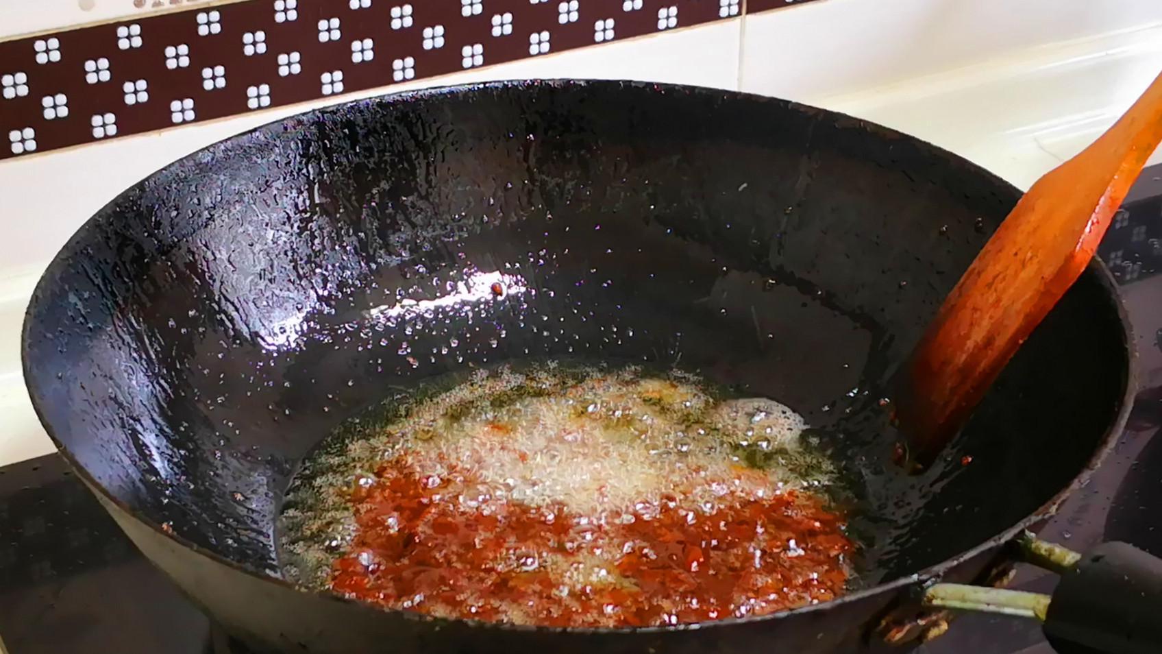 4.起鍋加稍微多一點的油,然後加入幾段大蔥,炸至大蔥顏色微微變焦時關火,控油撈出蔥段後,再加入2勺黃豆醬,繼續炸出蔥香味後關火。