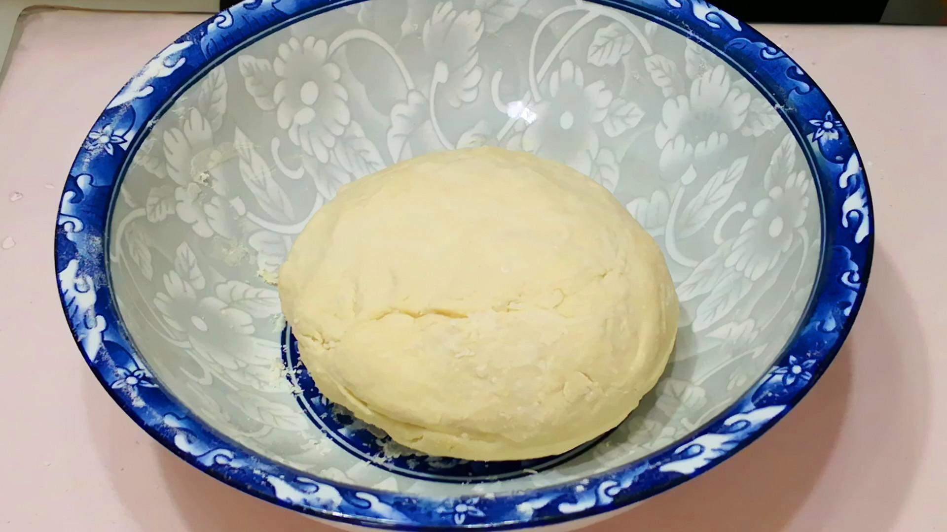 1.先調面,取適量的麪粉倒入面盆裏,接着再有涼水和麪,水要一點點加入,一邊加一邊用筷子不停地攪拌,讓面成面絮狀,攪拌至盆底沒有乾麪粉後,再下手將其揉成光滑的麪糰,放到一邊蓋上保鮮膜醒發備用。