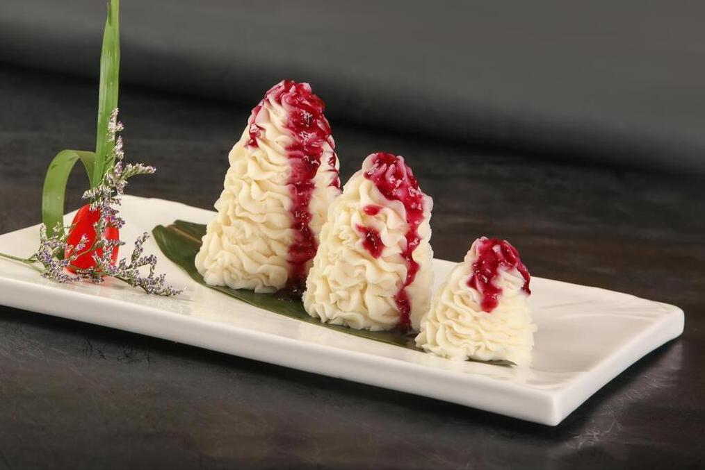藍莓醬中加上白糖,再用牛奶充分攪拌均勻,放在一旁備用,接着把山藥削皮後沖洗一下,洗乾淨之後上鍋,然後開始蒸,徹底蒸熟了之後就可以取出來了,然後將山藥放在小碗中捻碎,接着倒在裱花袋中擠成漂亮的形狀,最後澆上藍莓醬,開喫。