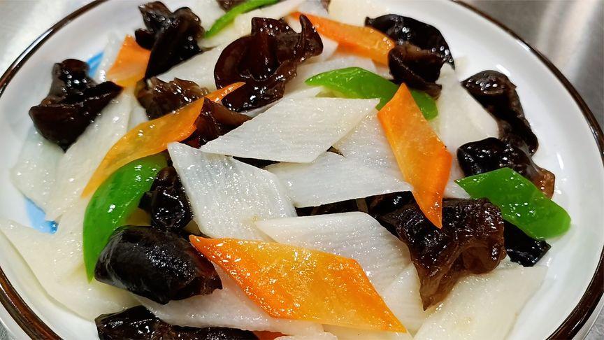 1、山藥去皮,洗淨切片;木耳泡發,洗淨撕成小朵;青椒、紅椒洗淨,切片。鍋中燒開水,放入山藥和木耳焯水,撈出瀝乾水分。