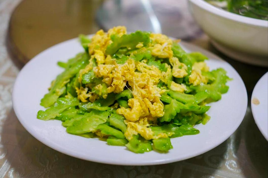 苦瓜切開把瓤子挖掉,切片以後下鍋焯水,隨後控幹水分備用,雞蛋打在碗裏打散備用,大蒜切片備用。鍋內倒油燒熱後,下入雞蛋炒熟盛出來,接着放入蒜片炒香,然後倒入苦瓜翻炒,炒到斷生後放入苦瓜,然後來點鹽和雞精調味,出鍋開喫。