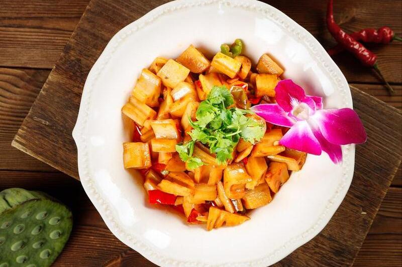 蓮藕削皮後洗淨,切成小丁,然後把蔥花也稍微切一下,接下來起鍋燒油,下入蓮藕大火快速翻炒一陣子,接着來調味,放上4勺生抽、1勺白糖、半勺醋、一點點鹽,繼續大火爆炒1分鐘,撒上蔥花出鍋。