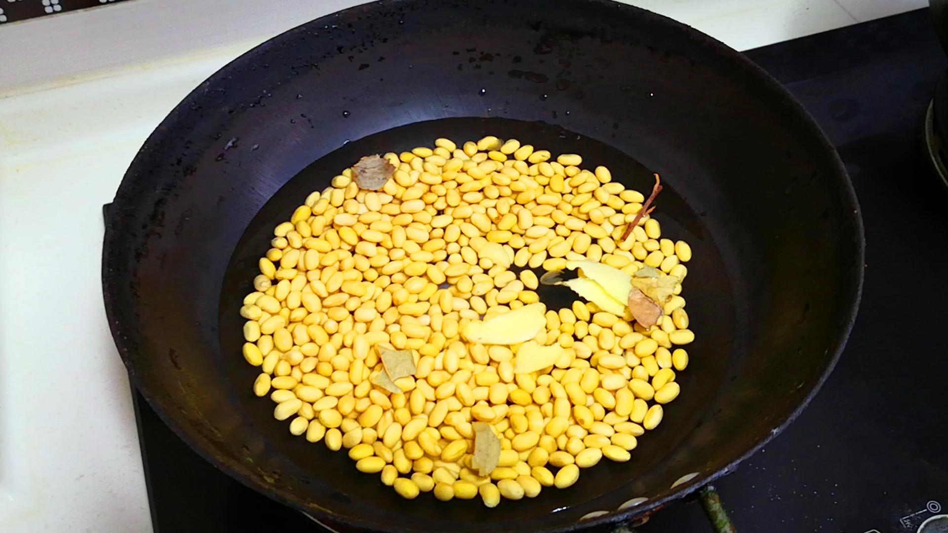 3、煮好的豆子撈出後控幹水分,並晾乾表面的水分,接着起鍋加油,油量稍微大一點,油溫五成熱下入下入花椒、桂皮、八角和香葉炸香,炸先後撈出,再倒入黃豆翻炒,一直翻炒至表皮微微起皺、微微變黃時,倒入蒜蓉和薑末爆香,炒香後,加入2勺甜麪醬、2勺豆瓣醬,然後翻炒,炒至每個黃豆都掛上大醬,飄出一股濃濃的醬香味,再倒入辣椒碎,把黃豆和辣椒的水分分別炒幹,撒入1把白芝麻,翻拌均勻後,倒入20克白酒,再次拌勻出鍋。加入白酒的目的就是防腐保鮮,延長存放時間。