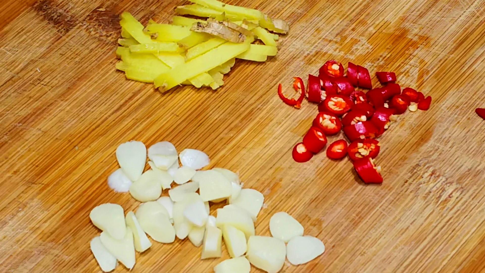 準備配料:趁晾韭苔的時候,我們準備一些蒜片、小米辣圈和生薑絲,量可以根據自己的口味,喜歡喫哪一種食材,就可以稍微多放一些。