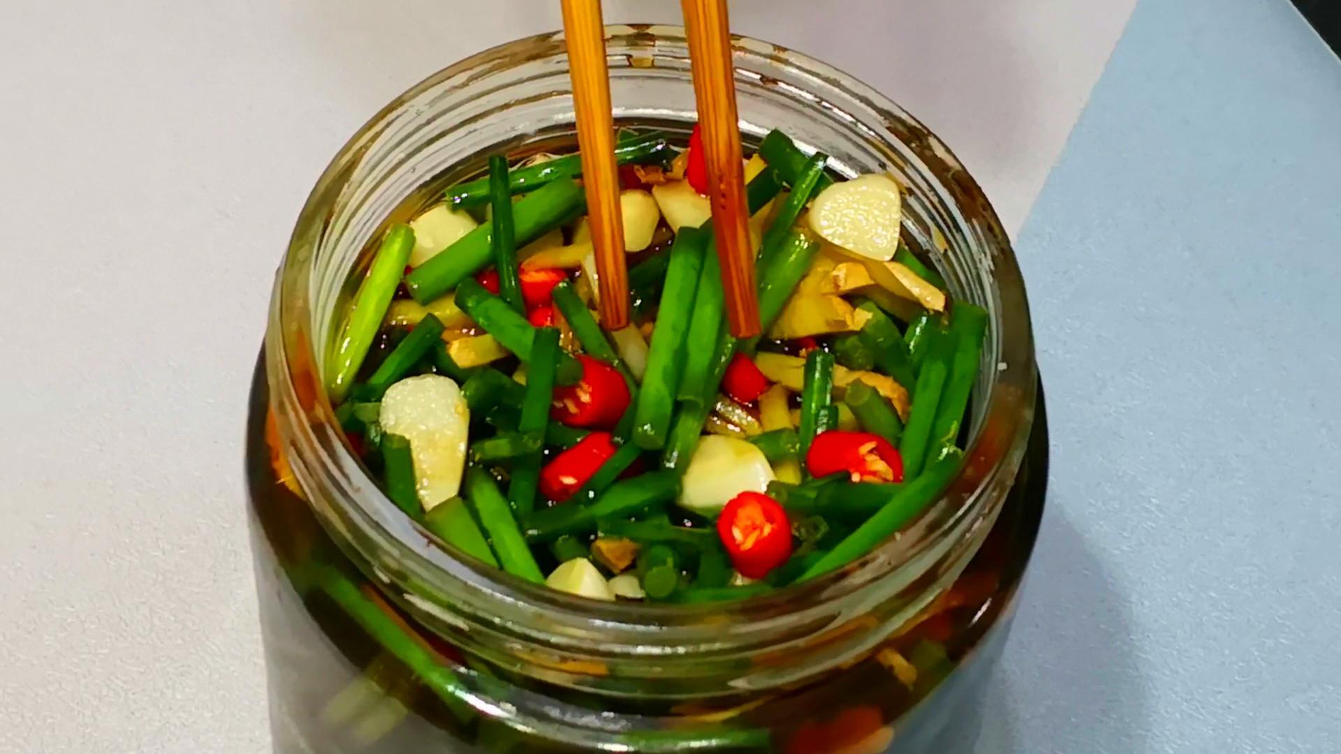 最後,取一個無水無油的瓶子,消毒後再將晾好的韭苔裝入,接着再把準備好的小米辣圈、薑絲和蒜片也裝入,然後加入適量的米醋和生抽,生抽和米醋要沒過韭苔,比例約爲1:1,再加入2勺白糖,攪拌均勻後封好瓶口,再把它放到冰箱中冷藏醃製即可,一般醃製一晚上後就會特別入味了!