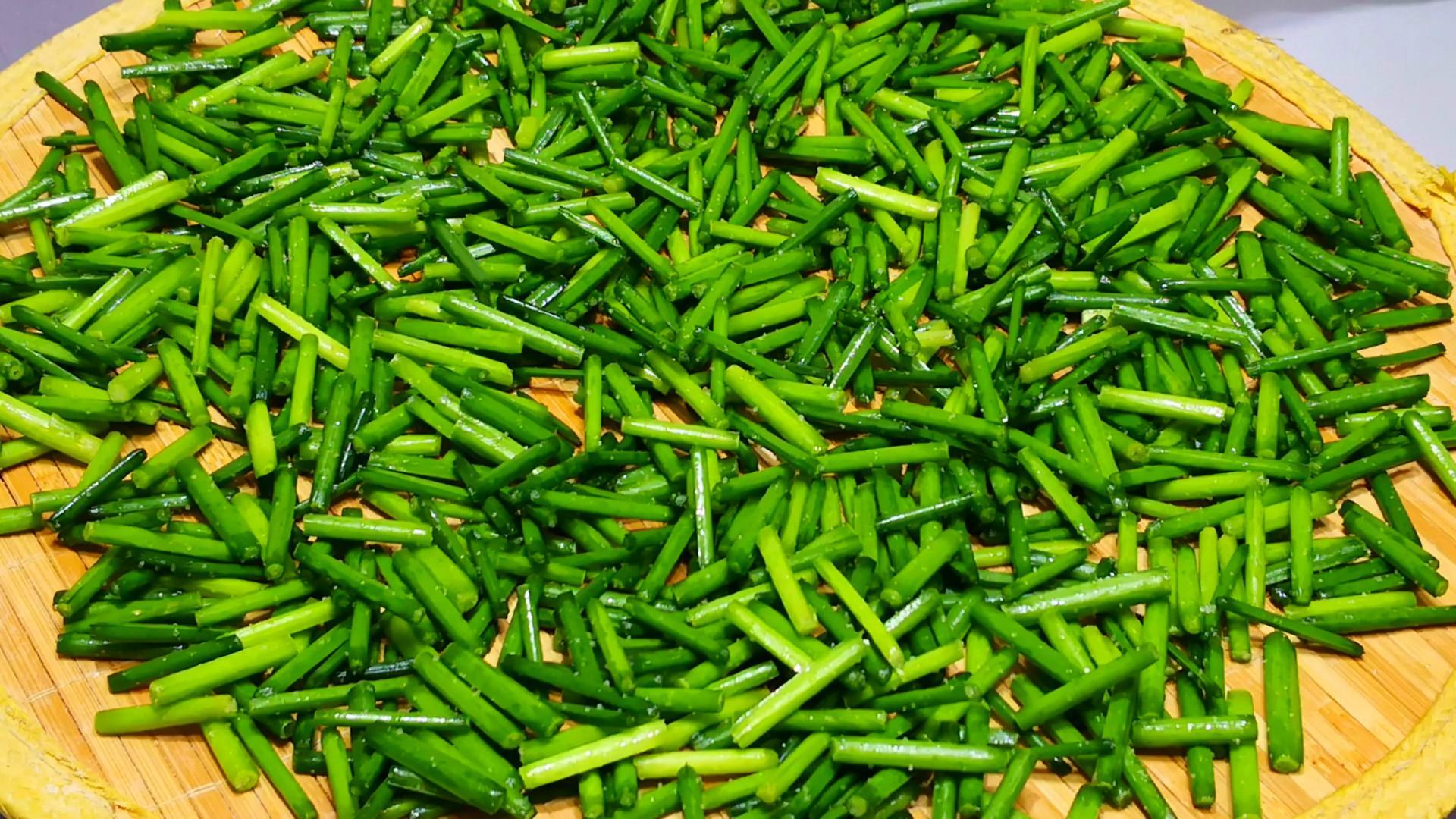 清洗韭苔:用清水將韭苔徹底搓洗乾淨,然後放到蓋簾上晾乾淨表面的水分。