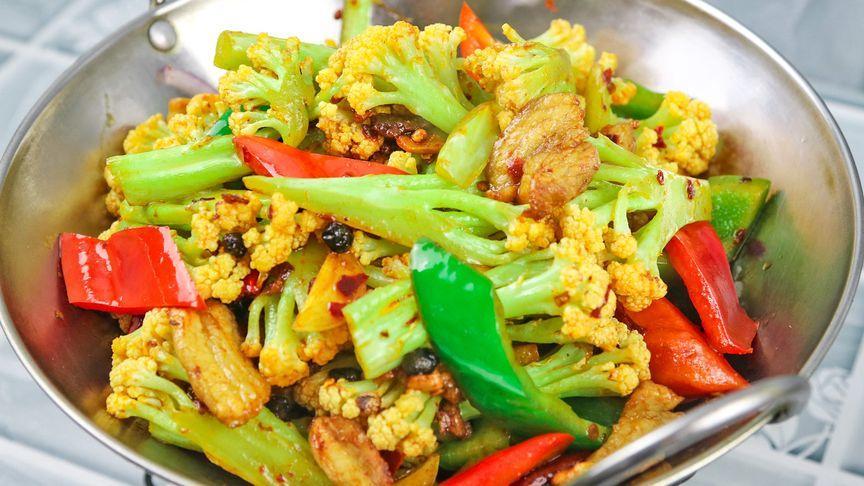 - 熱鍋涼油,放入五花肉煸炒出油,加入姜蒜末、幹辣椒段和豆瓣醬炒出紅油。放入花菜翻炒均勻,加入生抽、鹽和糖調味。最後加入青紅椒塊,翻炒至斷生即可。
