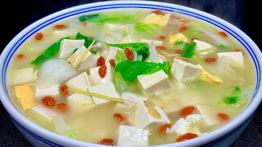 - 鍋中加水,放入蔥薑末燒開。放入豆腐煮幾分鐘。加入小白菜繼續煮。加鹽、雞精調味,淋入香油即可。