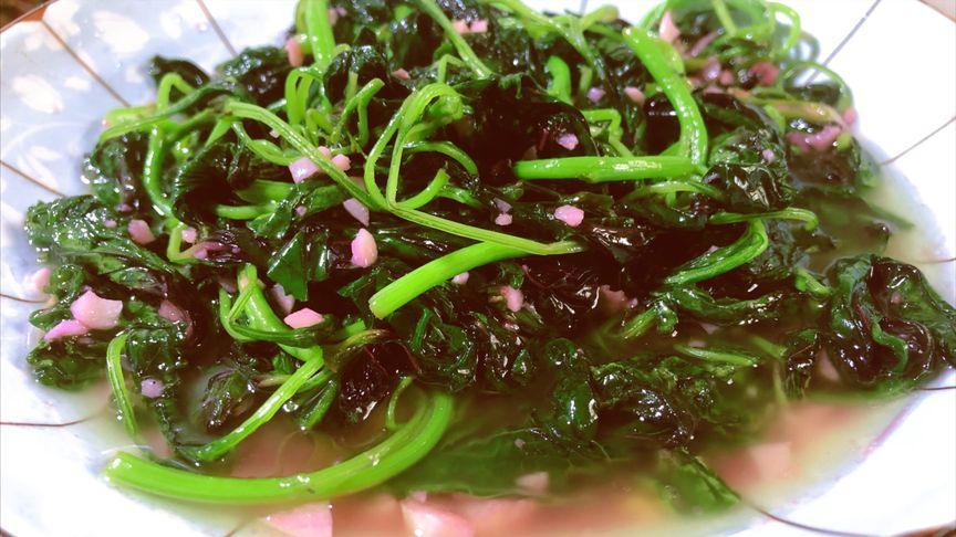 2、鍋中倒入油,油熱之後放入蔥和一半的蒜末,炒香之後放入莧菜,大火快速翻炒。放入適量鹽、少量雞精調味,最後放入剩下的一半蒜末,翻炒均勻後即可出鍋。