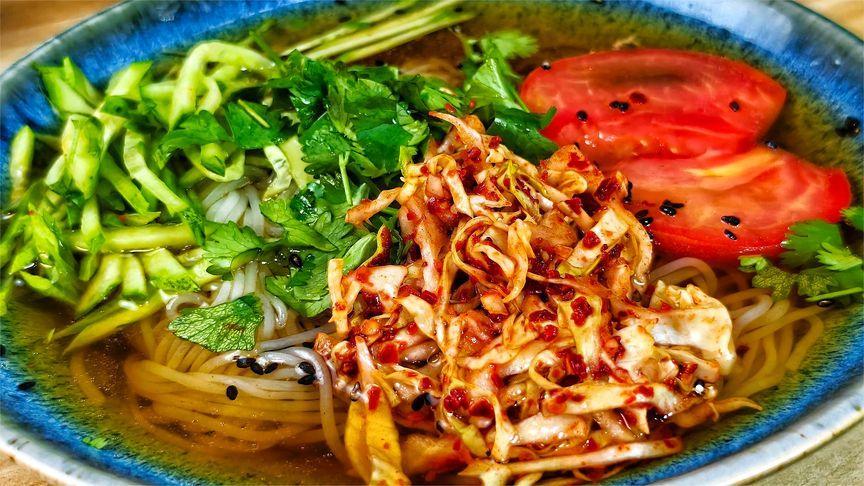 將冷麪煮熟後過冷水,配上黃瓜絲、胡蘿蔔絲、豆芽等蔬菜,再加入特製的冷麪醬料。冷麪入口爽滑,蔬菜清新爽口,讓人在炎熱的夏天也能大快朵頤。
