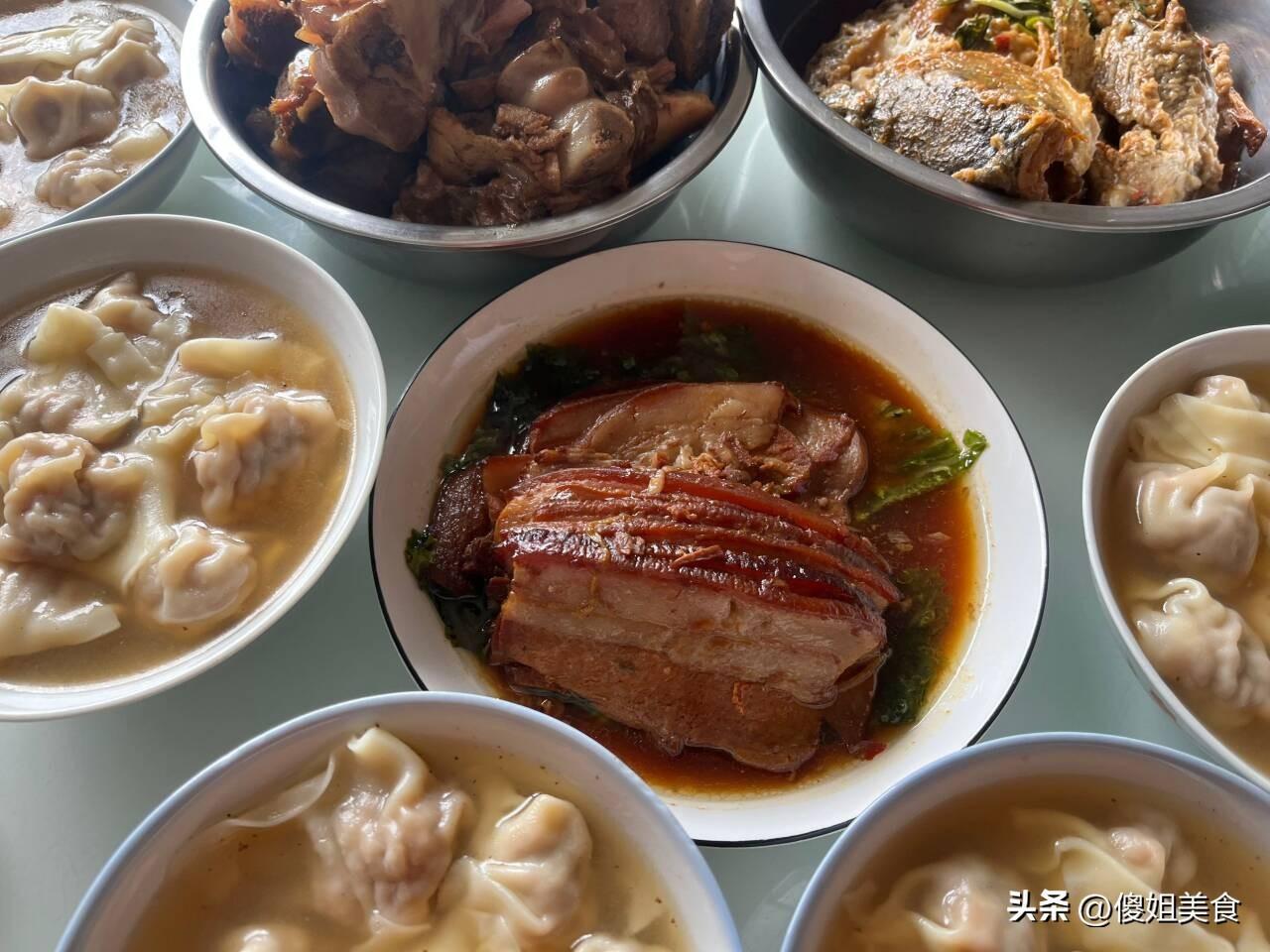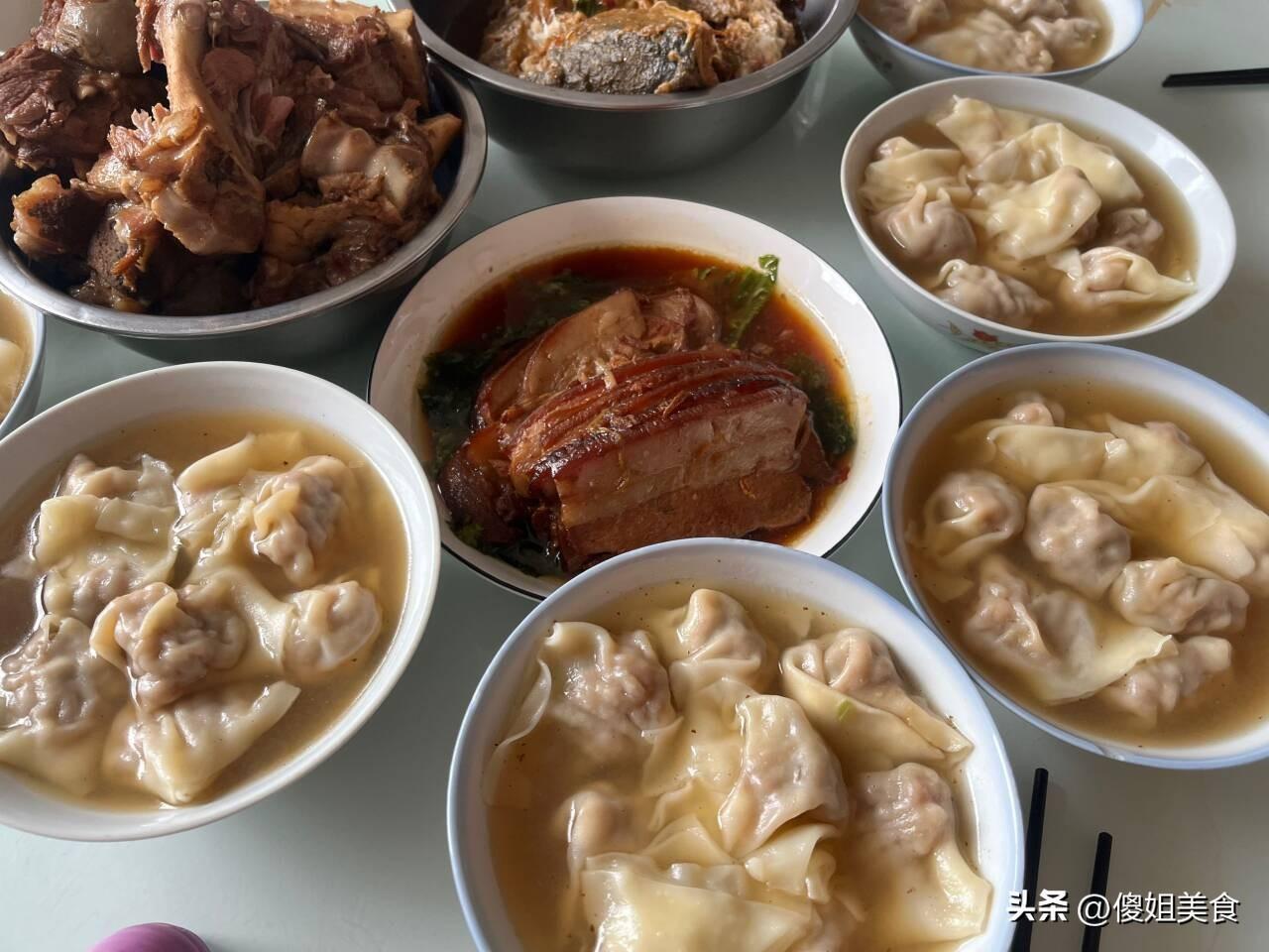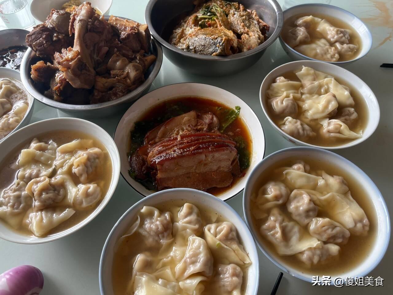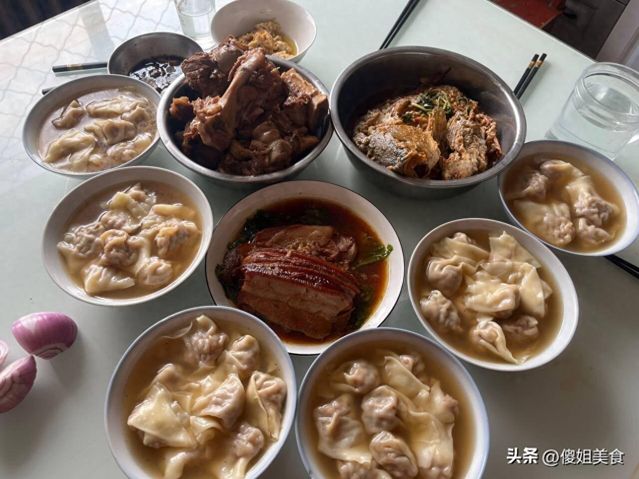 弟媳婦包的這餛飩味道真是絕絕子,純豬肉餡的,放了點大蔥和薑末,一口一個滿口留香,煮了一大鍋的餛飩喫到最後連湯汁都沒剩。這一上午把弟媳婦忙活的,弟媳婦滿臉笑容的說:熱也高興。這一大桌子硬菜,喫着是真香啊,雖然是剩菜,卻滿滿的都是愛,大家是不是也看餓了?