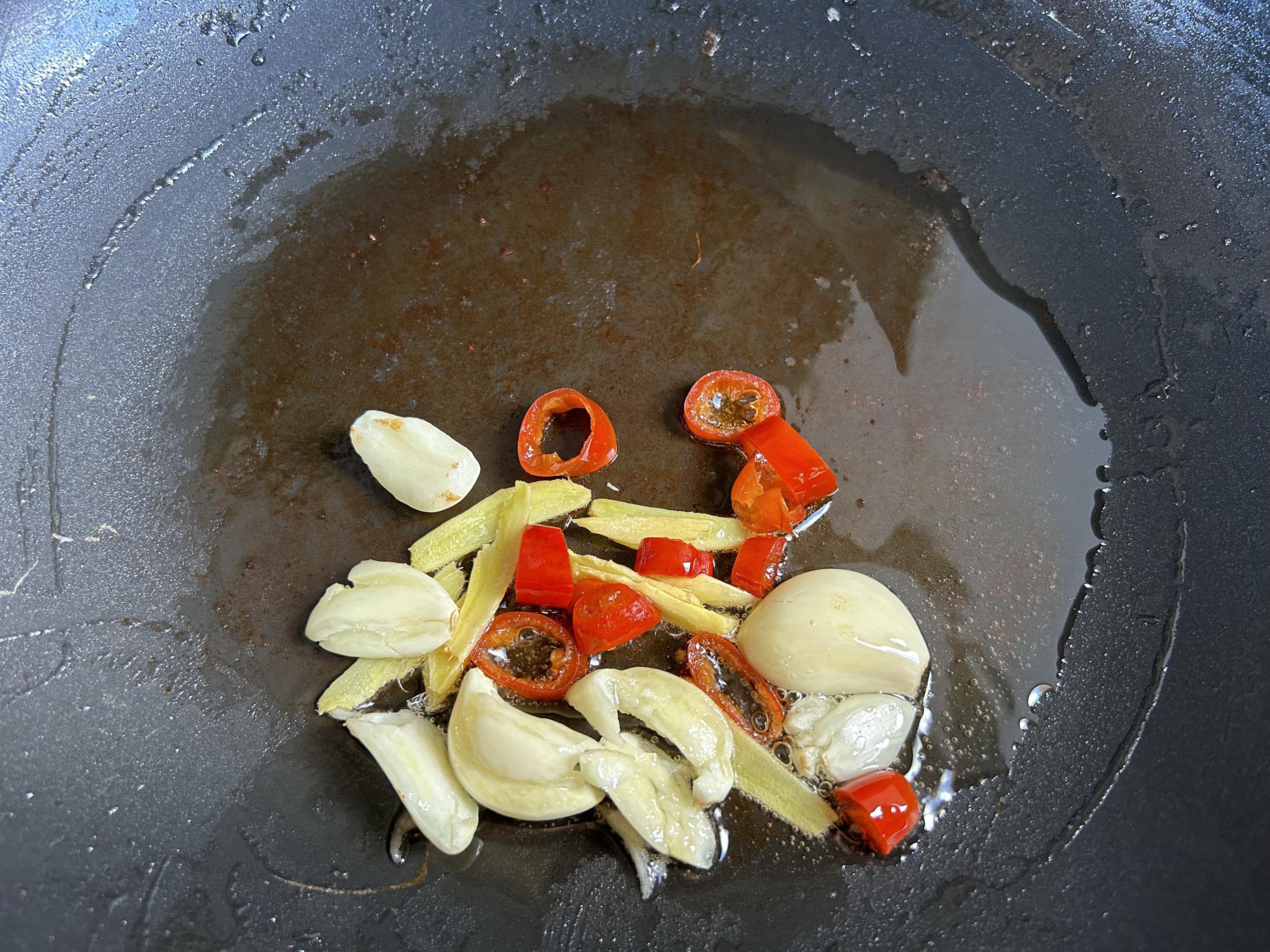 鍋裏重新放油,放入薑片、大蒜和泡椒翻炒出香味。