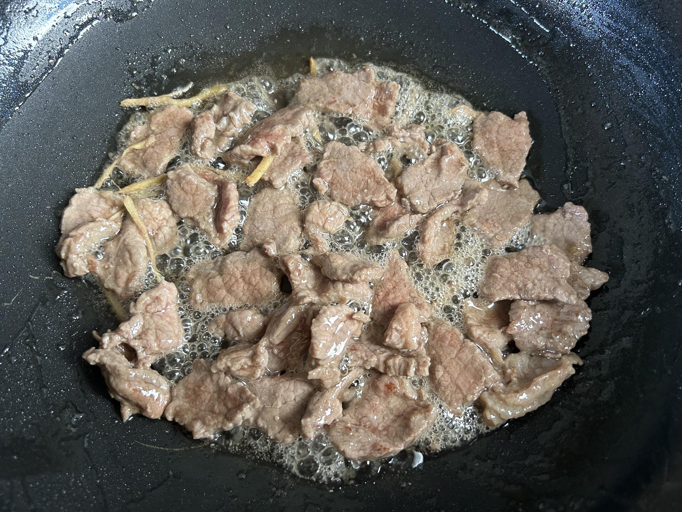 熱鍋放油,放入醃好的牛肉翻炒到熟透,盛出來備用,這樣牛肉纔不會炒老了。