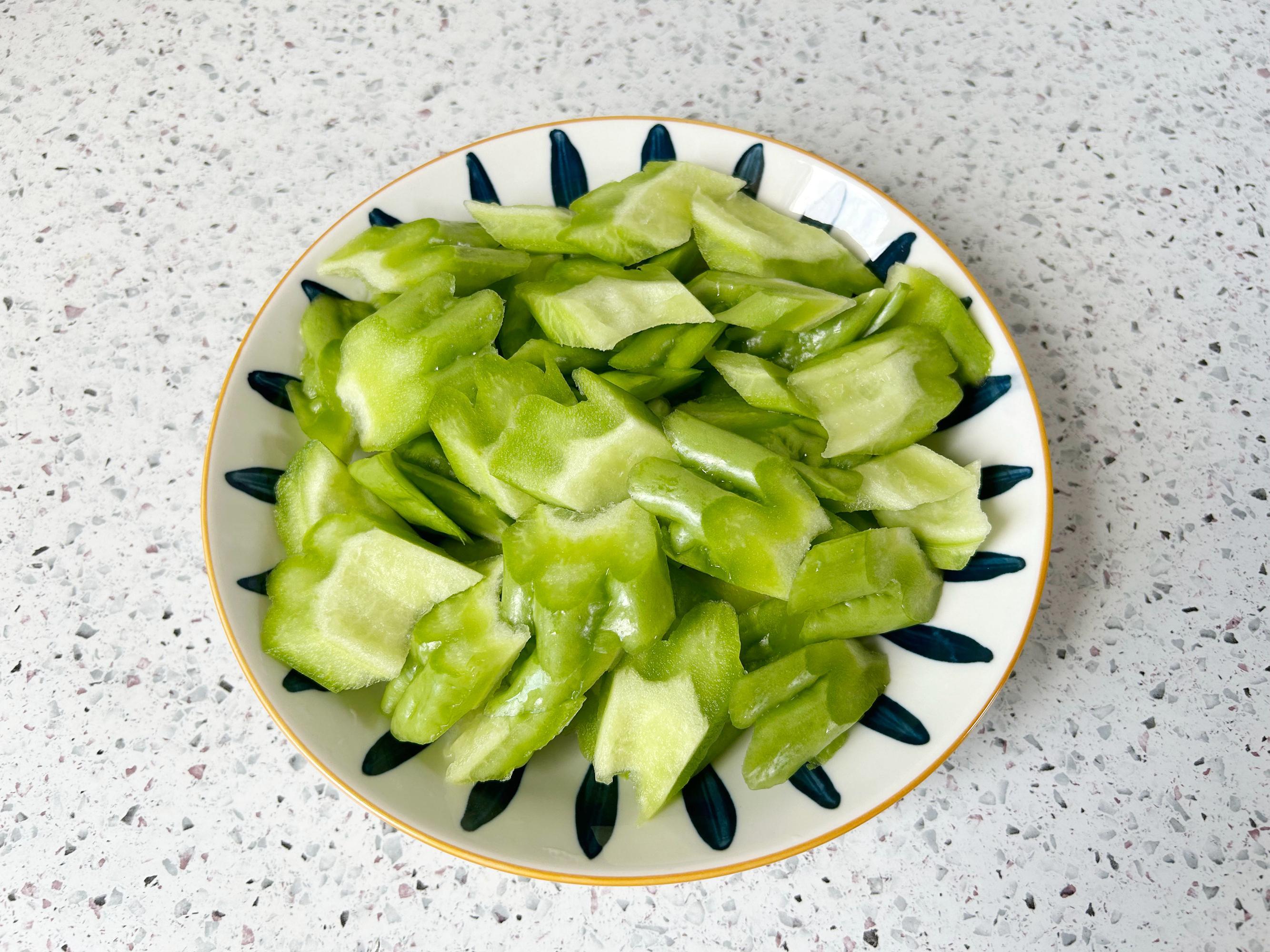 苦瓜清洗乾淨,對半切開,去瓤去籽,再分成3大塊,斜着剖成大塊。生薑去皮,一部分切薄片,一部分切絲,大蒜拍扁去皮,泡椒切小段。