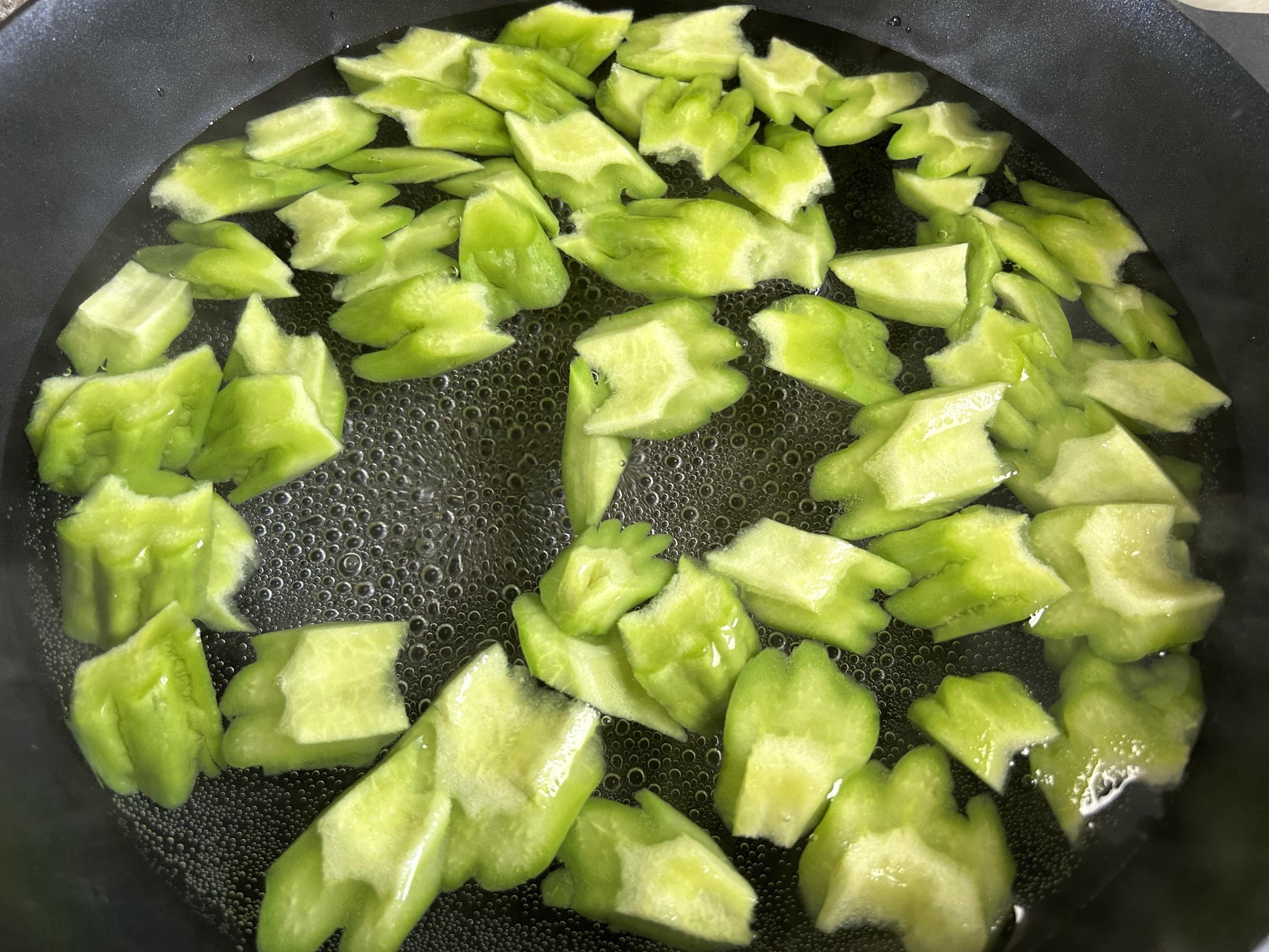 燒一鍋熱開水,放入苦瓜焯水煮3分鐘,撈出來瀝乾水分。我家喜歡喫熟透一點的苦瓜,焯水斷生方便後面炒熟,也可以去掉一部分苦味。