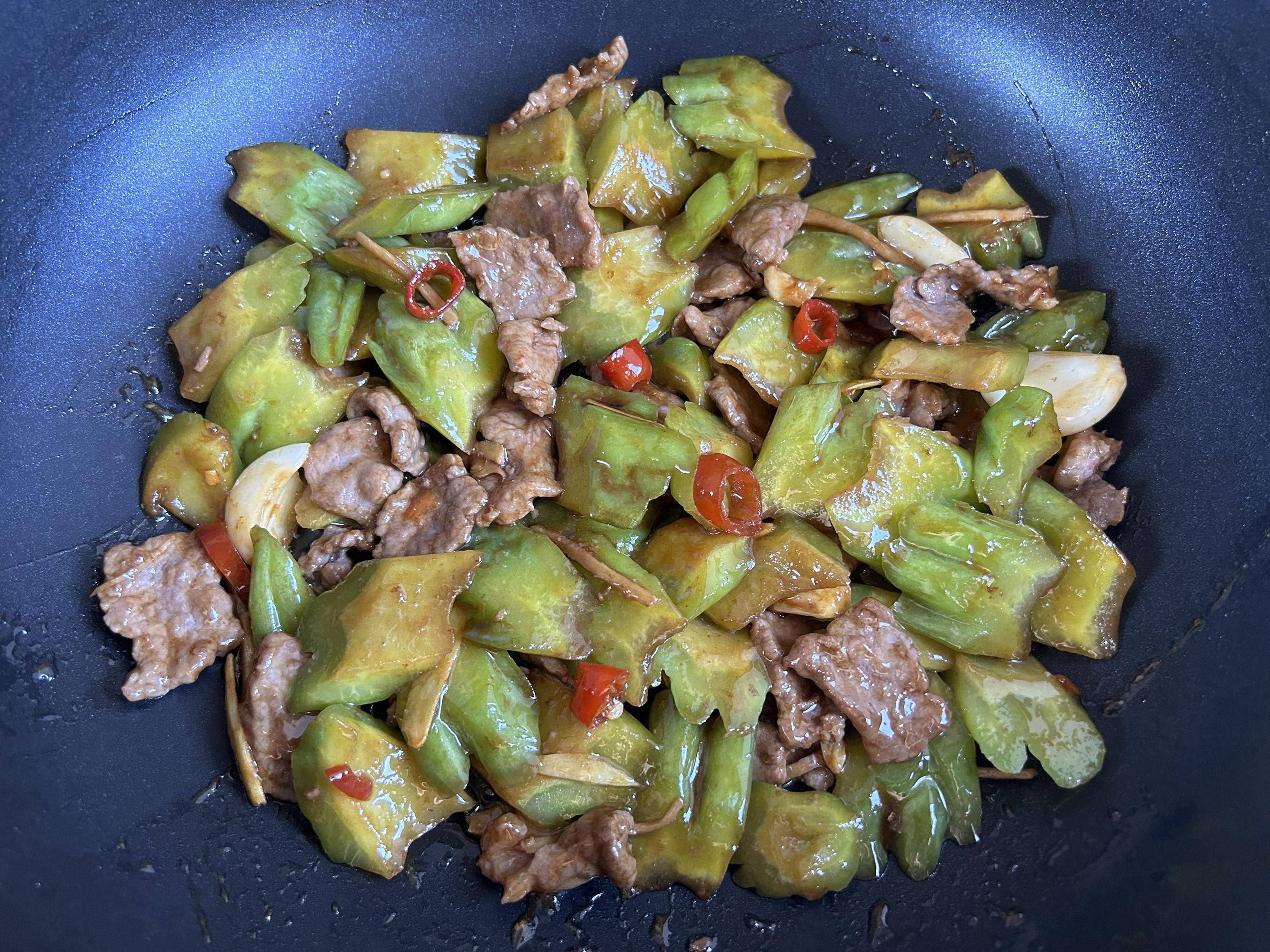 加入炒熟的牛肉,翻炒一會兒,按照個人口味加入適量的蠔油調味,翻炒均勻。這道營養好喫的苦瓜炒牛肉就做好了。
