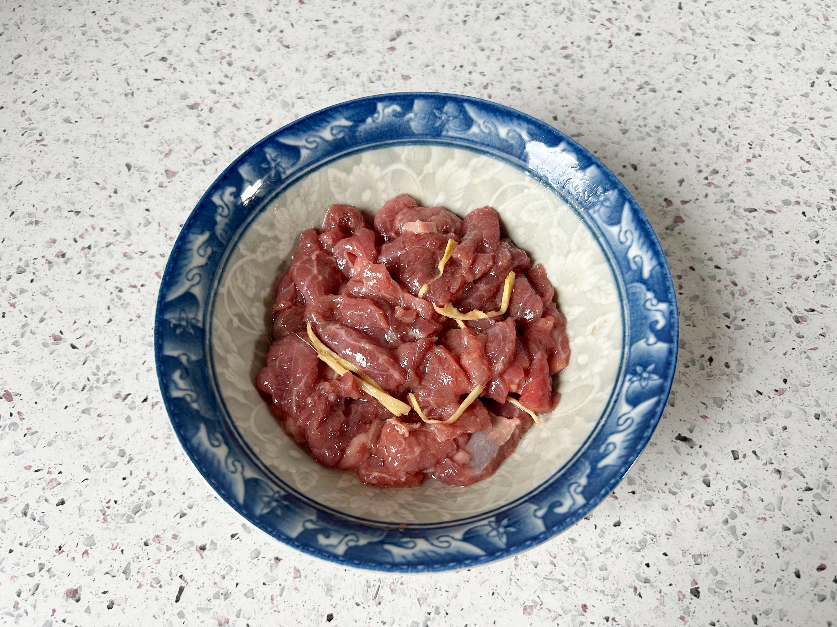 牛肉逆着紋路切成薄片,加入薑絲,加入玉米澱粉,翻拌均勻,醃製10分鐘。不喜歡喫牛肉的話,可以用瘦豬肉代替。