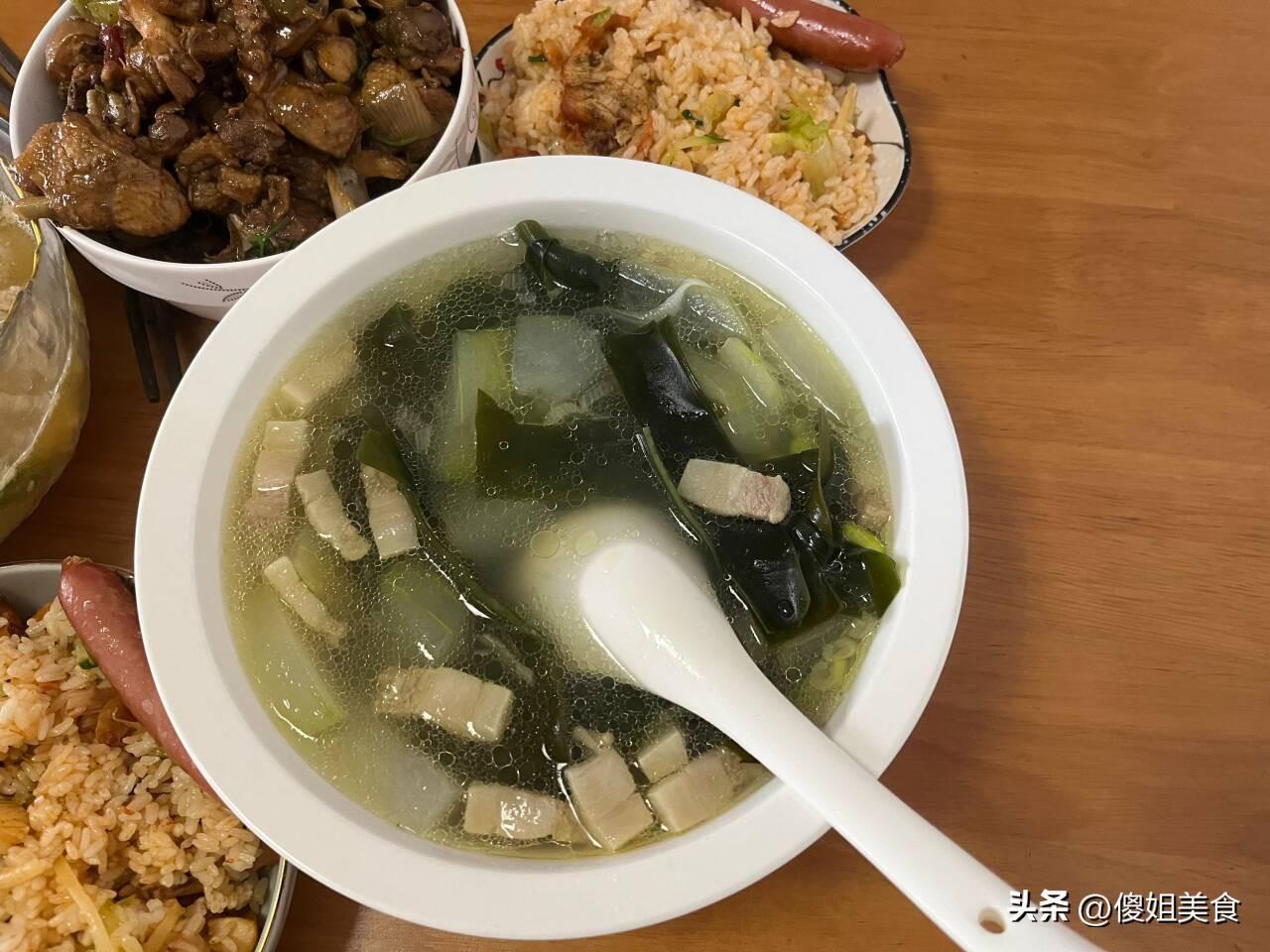 天熱少不了冬瓜湯,多喝些冬瓜湯可以利尿解暑,準備一小塊的冬瓜和少許的肉片,肉片用澱粉抓拌一下,使肉片更爽滑。熗鍋煸炒一下冬瓜,然後倒入清水,水煮沸騰後放入海帶和肉片,來少許鹽、胡椒粉和味極鮮攪拌調味,把蔬菜煮軟爛入味,把煮好的湯倒入碗內端上桌,鮮香美味,清淡不油膩。