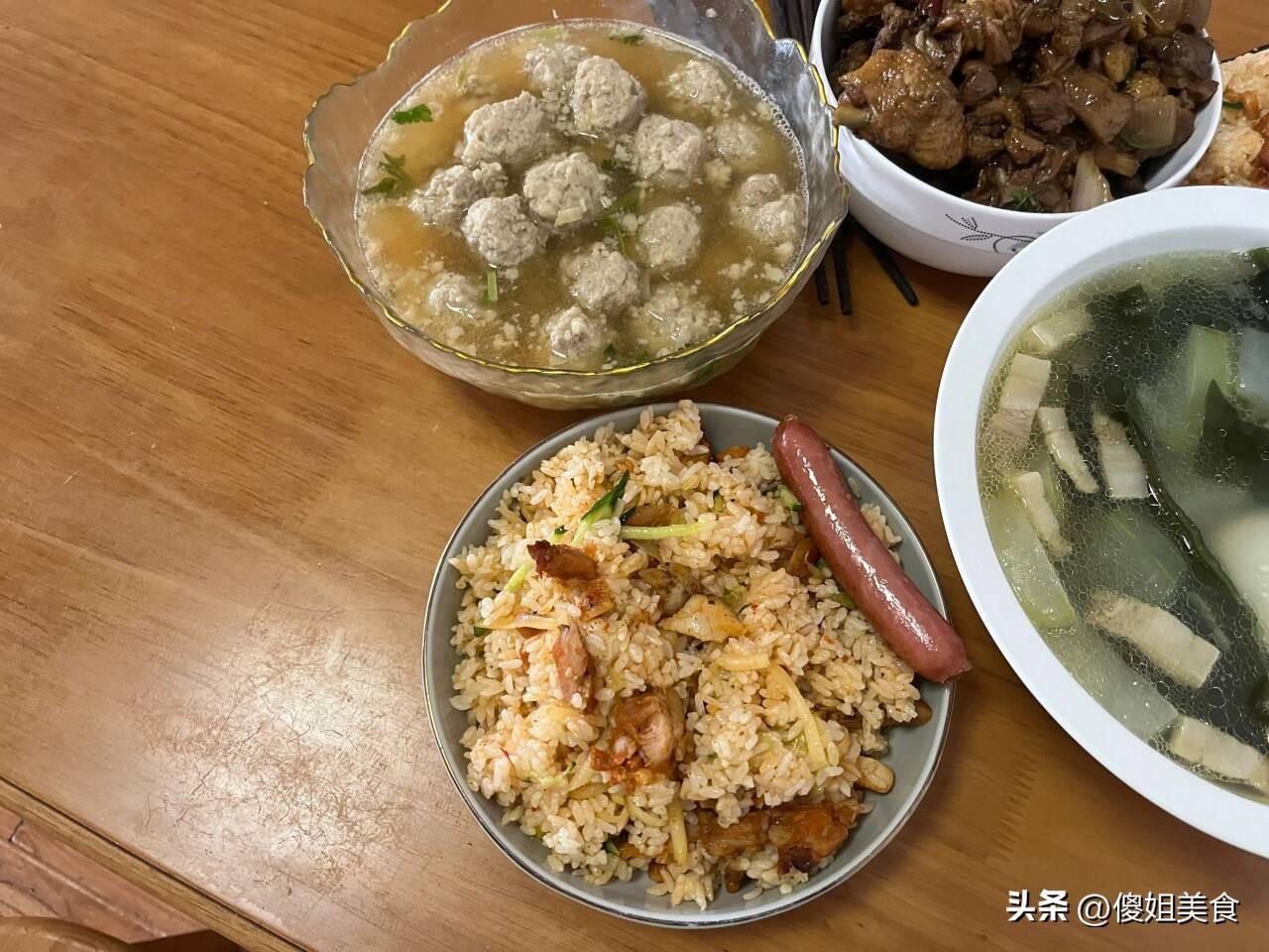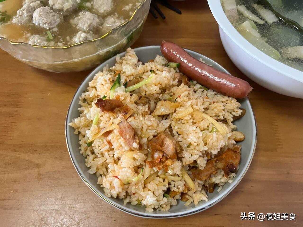 中午剩下了一些蒸米飯,炒了個孜然炒飯,先把乾巴的米飯用水攪拌一下,水量不要太多,然後切點黃瓜絲和大頭菜,把黃瓜絲和大頭菜熗炒好後放入米飯,倒點味極鮮、蠔油不停的翻炒入味。用電餅鐺煎了2個腸和雞胸肉,雞胸肉剁碎放在米飯裏拌均勻,給兩個孩子盛了滿滿2大盤,豐富的晚餐喫的很可口,營養又實惠。
