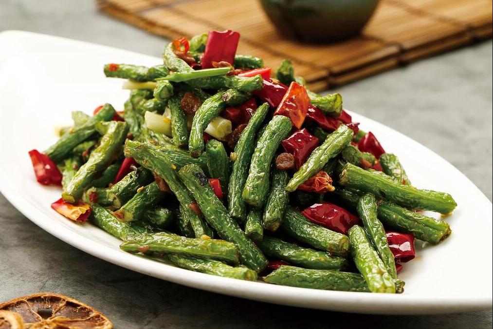 食材:四季豆、肉末、大蒜、幹辣椒、白芝麻、花椒、食鹽、雞精、生抽、食用油