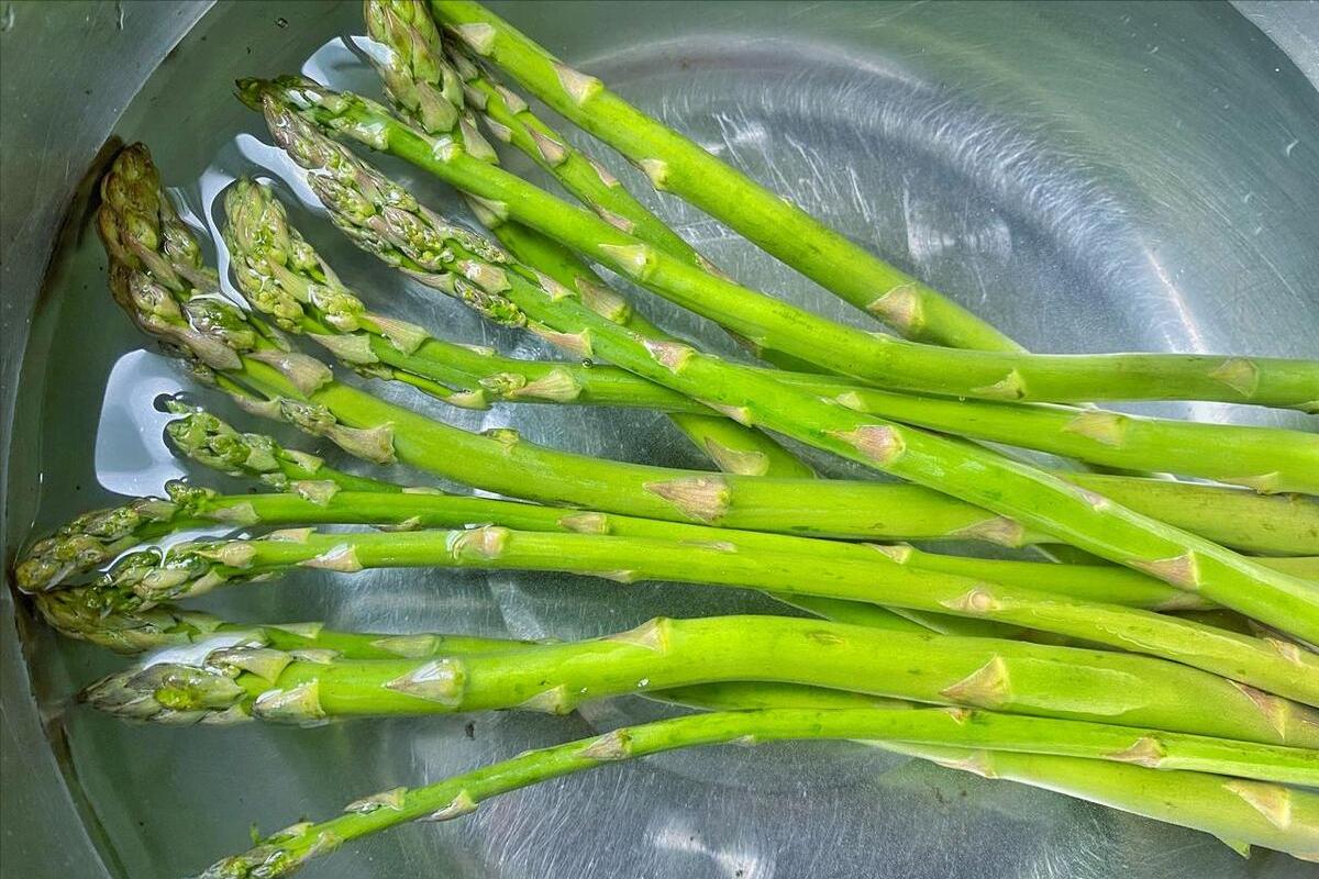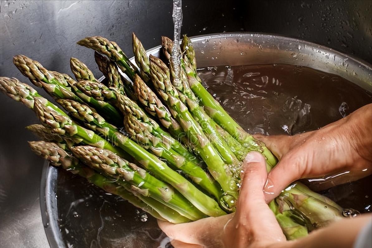 1、準備一把新鮮的蘆筍,太老的不要哈,不然嚼不動還有絲,把蘆筍的頭尾去掉以後,然後放在水中進行清洗,洗淨之後切成段狀。