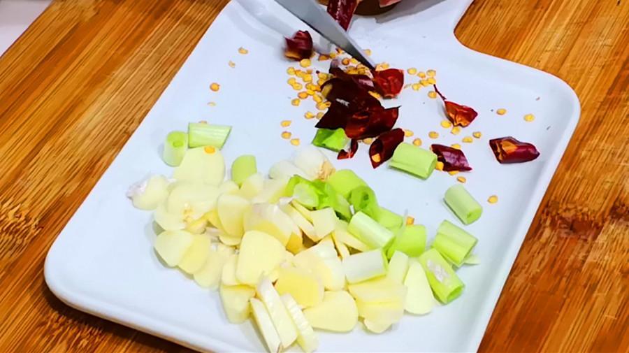 2.再準備一些配料:大蒜多一些切成大蒜片;小蔥一棵切蔥花;適量幹辣椒用剪刀剪成成辣椒段,全都放一起備用。