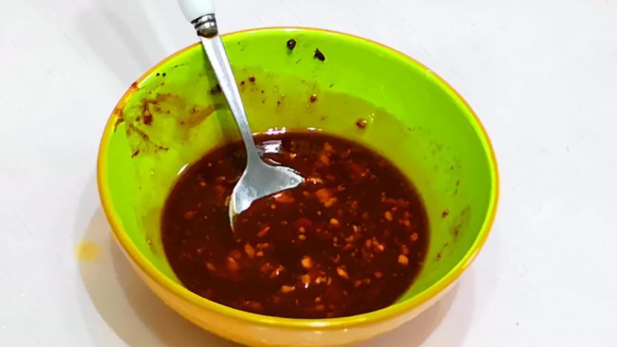 5.調個料汁:碗中放入一塊豆腐乳,將其碾碎後,再加入一匙食鹽、一匙白糖,適量的蠔油和生抽,攪拌均勻備用。